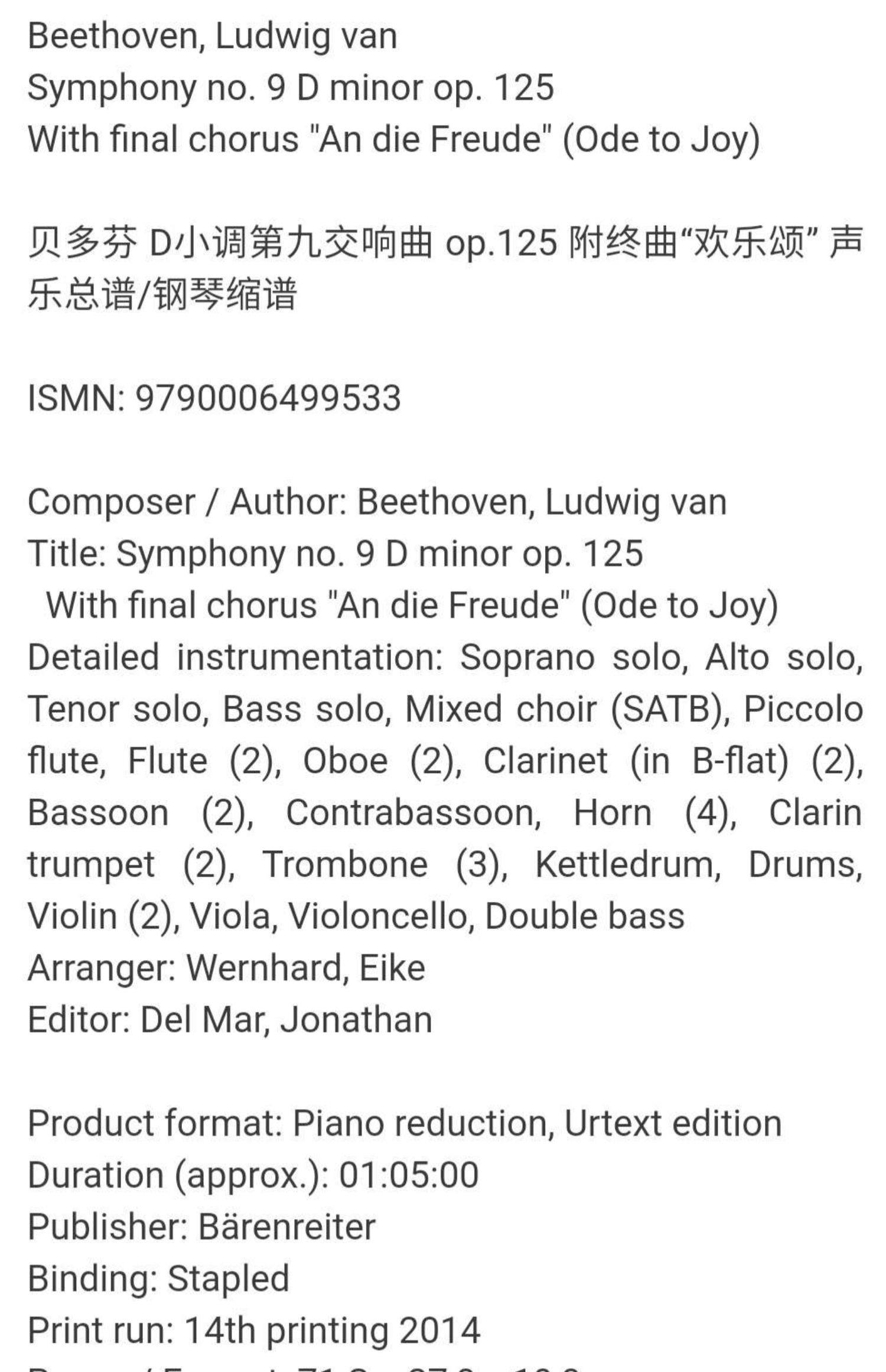 Бетховен D Симфония девятая симфония OP125 Финальная песня Ode Ode to Songle Vocal Spectrum/Piano Chroxer Book Book Beather Symphony A Die Freude BA9009-90