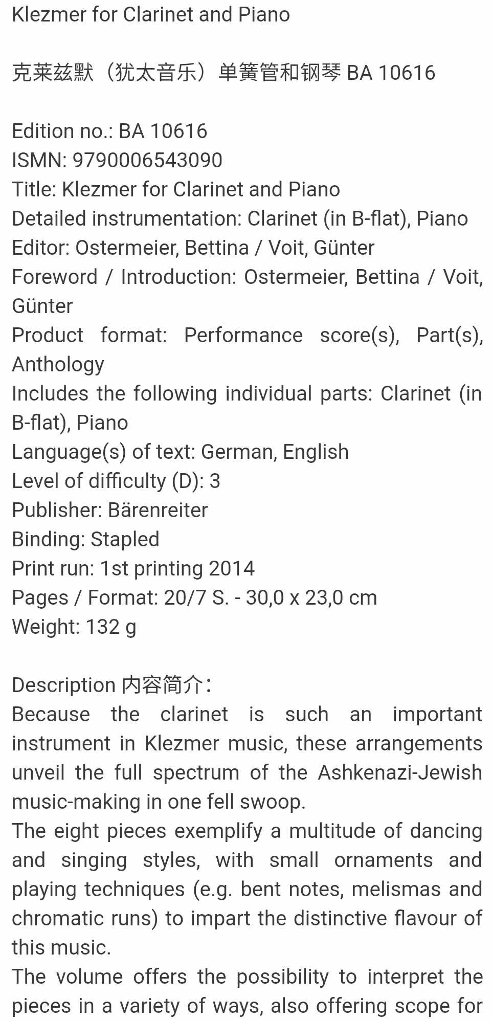Описание товараPHAgc3R5bGU9InRleHQtYWxpZ246IGNlbnRlcjsiPjxzdHJvbmc+PHNwYW4gc3R5bGU9ImNvbG9yOiAjMzMzMzMzO2ZvbnQtZmFtaWx5OiBtaWNyb3NvZnQgeWFoZWk7dGV4dC1hbGlnbjoganVzdGlmeTsiPktsZXptZXIgZm9yIENsYXJpbmV0IGFuZCBQaWFubzwvc3Bhbj48YnIgc3R5bGU9IiI+PGJyIHN0eWxlPSIiPjxzcGFuIHN0eWxlPSJjb2xvcjogIzMzMzMzMztmb250LWZhbWlseTogbWljcm9zb2Z0IHlhaGVpO3RleHQtYWxpZ246IGp1c3RpZnk7Ij7QmtC70LXQt9C80LXRgCAo0LXQstGA0LXQudGB0LrQsNGPINC80YPQt9GL0LrQsCkg0JrQu9Cw0YDQvdC10YIg0Lgg0YTQvtGA0YLQtdC/0LjQsNC90L4gQkEgMTA2MTY8L3NwYW4+PGJyIHN0eWxlPSIiPjxiciBzdHlsZT0iIj48c3BhbiBzdHlsZT0iY29sb3I6ICMzMzMzMzM7Zm9udC1mYW1pbHk6IG1pY3Jvc29mdCB5YWhlaTt0ZXh0LWFsaWduOiBqdXN0aWZ5OyI+RWRpdGlvbiBuby46Jm5ic3A7QkEgMTA2MTY8L3NwYW4+PGJyIHN0eWxlPSIiPjxzcGFuIHN0eWxlPSJjb2xvcjogIzMzMzMzMztmb250LWZhbWlseTogbWljcm9zb2Z0IHlhaGVpO3RleHQtYWxpZ246IGp1c3RpZnk7Ij5JU01OOiZuYnNwOzk3OTAwMDY1NDMwOTA8L3NwYW4+PC9zdHJvbmc+PGJyPjwvcD48cCBzdHlsZT0idGV4dC1hbGlnbjogY2VudGVyOyI+PGltZyBzcmM9Imh0dHBzOi8vaW1nLmFsaWNkbi5jb20vaW1nZXh0cmEvaTEvMjIwNzI3NzY1MDk0MS9PMUNOMDFDeHlyM2cxSXAxSG5GakxNb18hITIyMDcyNzc2NTA5NDEuanBnIiBhbGlnbj0iYWJzbWlkZGxlIiBzdHlsZT0id2lkdGg6IDcwMC4wcHg7Ij48aW1nIHNyYz0iaHR0cHM6Ly9pbWcuYWxpY2RuLmNvbS9pbWdleHRyYS9pNC8yMjA3Mjc3NjUwOTQxL08xQ04wMXV2d1ByYTFJcDFIbGhmaHd4XyEhMjIwNzI3NzY1MDk0MS5qcGciIGFsaWduPSJhYnNtaWRkbGUiIHN0eWxlPSJ3aWR0aDogNzAwLjBweDsiPjxpbWcgc3JjPSJodHRwczovL2ltZy5hbGljZG4uY29tL2ltZ2V4dHJhL2k0LzIyMDcyNzc2NTA5NDEvTzFDTjAxZmlhWG1GMUlwMUhtaURLTFVfISEyMjA3Mjc3NjUwOTQxLmpwZyIgYWxpZ249ImFic21pZGRsZSIgc3R5bGU9IndpZHRoOiA3MDAuMHB4OyI+PGltZyBzcmM9Imh0dHBzOi8vaW1nLmFsaWNkbi5jb20vaW1nZXh0cmEvaTMvMjIwNzI3NzY1MDk0MS9PMUNOMDF4eDNRZ2oxSXAxSGpNbk5HRF8hITIyMDcyNzc2NTA5NDEuanBnIiBhbGlnbj0iYWJzbWlkZGxlIiBzdHlsZT0id2lkdGg6IDcwMC4wcHg7Ij48aW1nIHNyYz0iaHR0cHM6Ly9pbWcuYWxpY2RuLmNvbS9pbWdleHRyYS9pMi8yMjA3Mjc3NjUwOTQxL08xQ04wMTEyQ3hlMjFJcDFIYzFVUTcyXyEhMjIwNzI3NzY1MDk0MS5wbmciIGFsaWduPSJhYnNtaWRkbGUiPjwvcD48cCBzdHlsZT0idGV4dC1hbGlnbjogY2VudGVyOyI+PGltZyBzcmM9Imh0dHBzOi8vaW1nLmFsaWNkbi5jb20vaW1nZXh0cmEvaTEvMjIwNzI3NzY1MDk0MS9PMUNOMDFweFNtMW0xSXAxSTFqcldGQl8hITIyMDcyNzc2NTA5NDEucG5nIiBhbGlnbj0iYWJzbWlkZGxlIj48L3A+