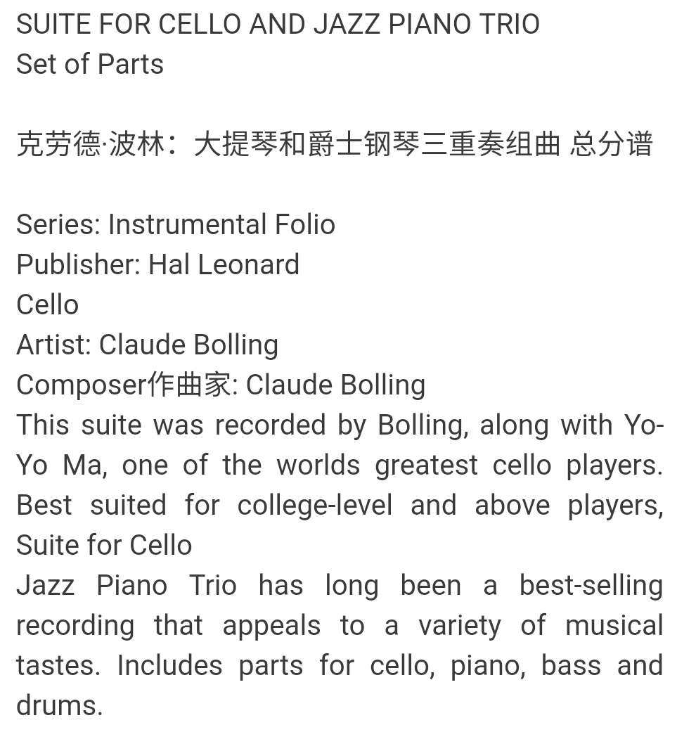 Pre -Sale of Villo и Jazz Piano Trilatearal Bcores, Книга Клода Берлина Хеленде Боллинг для виолончели и джазового фортепиано HL 356320