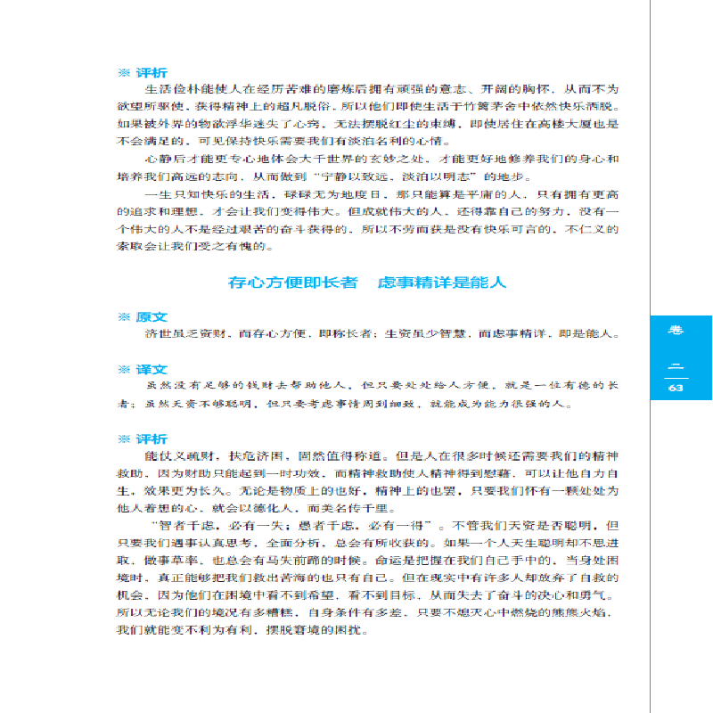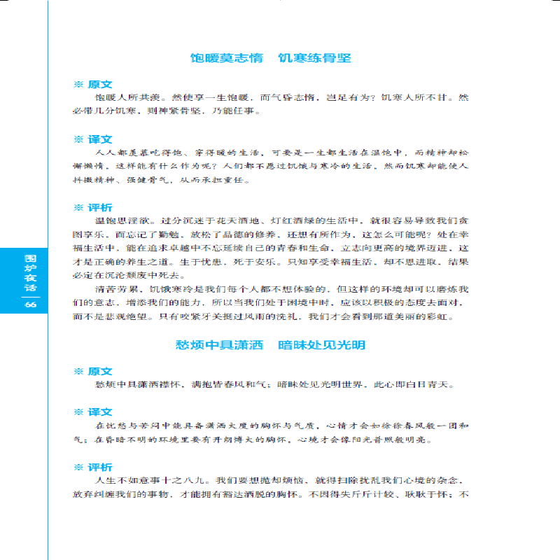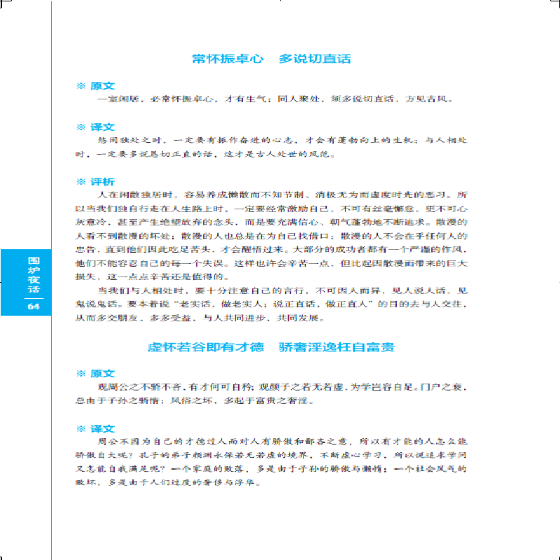 Язык этой книги прост, простой и прост для понимания, но он имеет глубокое значение и задуматься.Книга говорит людям быть спокойными, доступными, а не нарушать жителей деревни и быть высокими.Делать вещи должно быть справедливым и честным, ярким и ясным, не спекулировать, лицемерно и хитры, и использовать добрые намерения как мудрость.Хотя они оба в трех словах, уровень структуры не так ясен, как «маленькое окно», но его можно описать как“&Rdquo;, Коннотация чрезвычайно глубока, и мысли, которые проходят до конца, являются в основном подлинным конфуцианством, что имеет обширное образование.Кроме того, книга также растопила множество эмоций, таких как кнут, руководство, ирония и убеждение, и представила глубокие принципы жизни на изысканном языке, заставляя людей читать и вперед и приносит большую пользу.