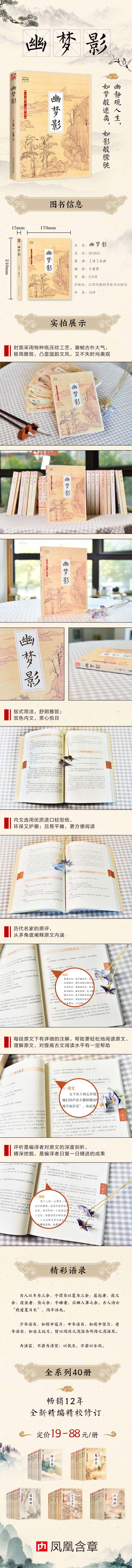 Книга "Youmeng Shadow" состоит из 219 философии жизни. Книги, разговор о медитации, выпивке и игре и т. Д. Подождите, наиболее обсуждаются эти аспекты.В этих текстах отражается восприятие автора и общества. Существует просветление и исследование конфуцианства, интерпретации и даосизма.С точки зрения языка, автор осмеливается ассоциировать и представить, когда они писали, и дает духовность существам в природе в произведениях. лучше.Кроме того, есть комментарии к тексту. Полицейские, и провинция спровоцирована.Девиз, девиз, философия, рифма и тревога в чтении в чтении, наблюдение за жизнью и природой с тихим отношением, так же, как сны, как сны, как тень, наслаждайтесь чувствами и опытом жизни художника, трогательной сущности