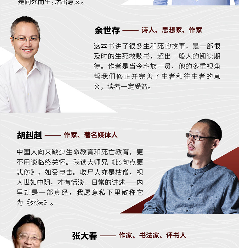 Конфуций сказал,“ неизвестная жизнь, зная смерть” "Хуан Тин Цзин" сказал, сказал,&Ldquo;” Zhuangzi сказал,&Ldquo; Drum Basin Song, AO Ran Ran Happy”.Избегать, страх и радость, за этим стоит противостоять смерти с жизнью.На самом деле смерть - это часть жизни и навсегда из -за жизни.История похоронного бюро, записанного «грустью, чем конец», не только дает нам знать смерть и принять смерть, но, что более важно, имеет смысл умереть.