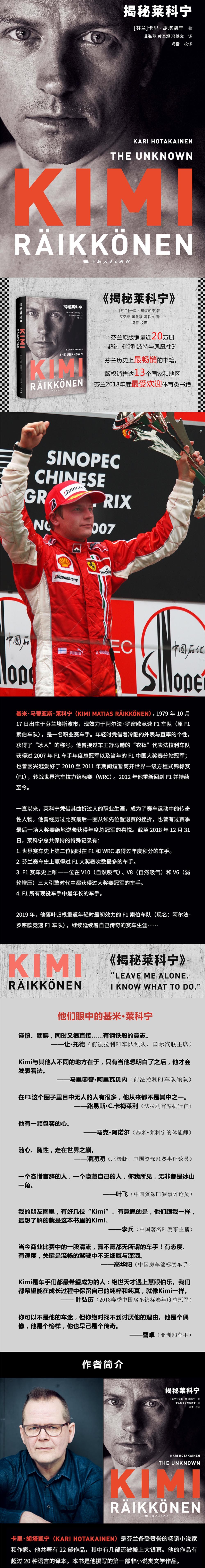 в этом фильме Кими&Булл;Этот бывший чемпион мира Ferrari всегда был непостижимым, уделяет большое внимание конфиденциальности и редко раскрывает свои чувства к внешнему миру.&Булл;Ху Такинг раскрывает редко известную сторону Райкконена читателям, ведущих читателей Гран -при Ф1 по всему миру и захватывает замечательные истории, стоящие за каждой игрой.В то же время эта книга также открывает дверь для личной жизни Райкконена, и, как правило, он всегда тщательно защищает свою семью.Контент, записанный в этой книге, наверняка сделает все фанаты, которые давно восхищаются этим финским водителем счастливыми.