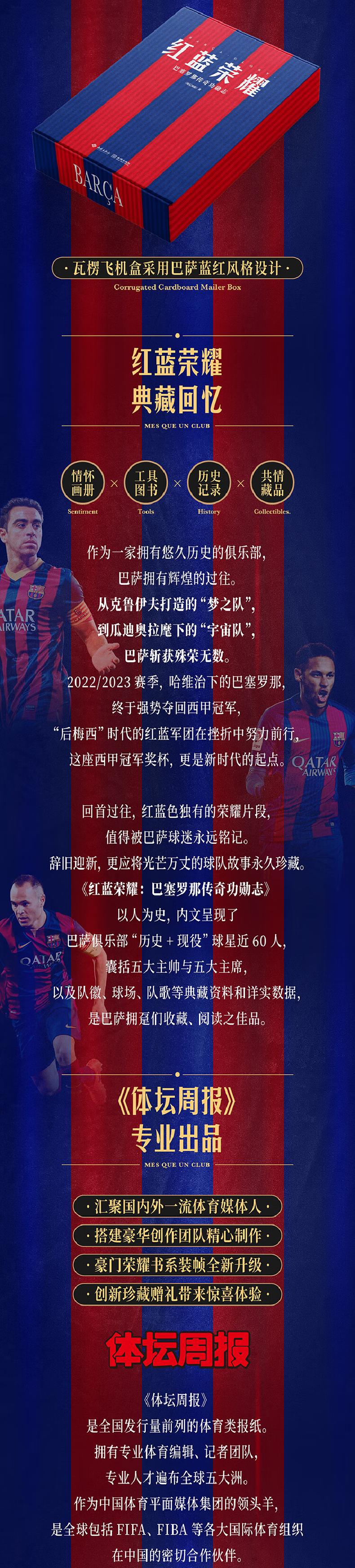 Оглядываясь назад, можно сказать, что уникальные моменты славы красно-синих достойны памяти болельщиков «Барселоны».Прощаясь со старым и приветствуя новое, мы должны дорожить великолепной историей команды.«Красная и синяя слава: легендарный вклад Барселоны» основана на истории народа, а текст представляет клуб «Барселона».“История + текущий сервис”Здесь представлено около 60 игроков, в том числе пять основных тренеров и пять главных президентов, а также эмблемы команд, стадионы, гимны команд и другие коллекции и подробные данные.Это хорошая коллекция и чтение для болельщиков «Барселоны». Изысканный переплет набора подарит поклонникам уникальный сюрприз при распаковке.