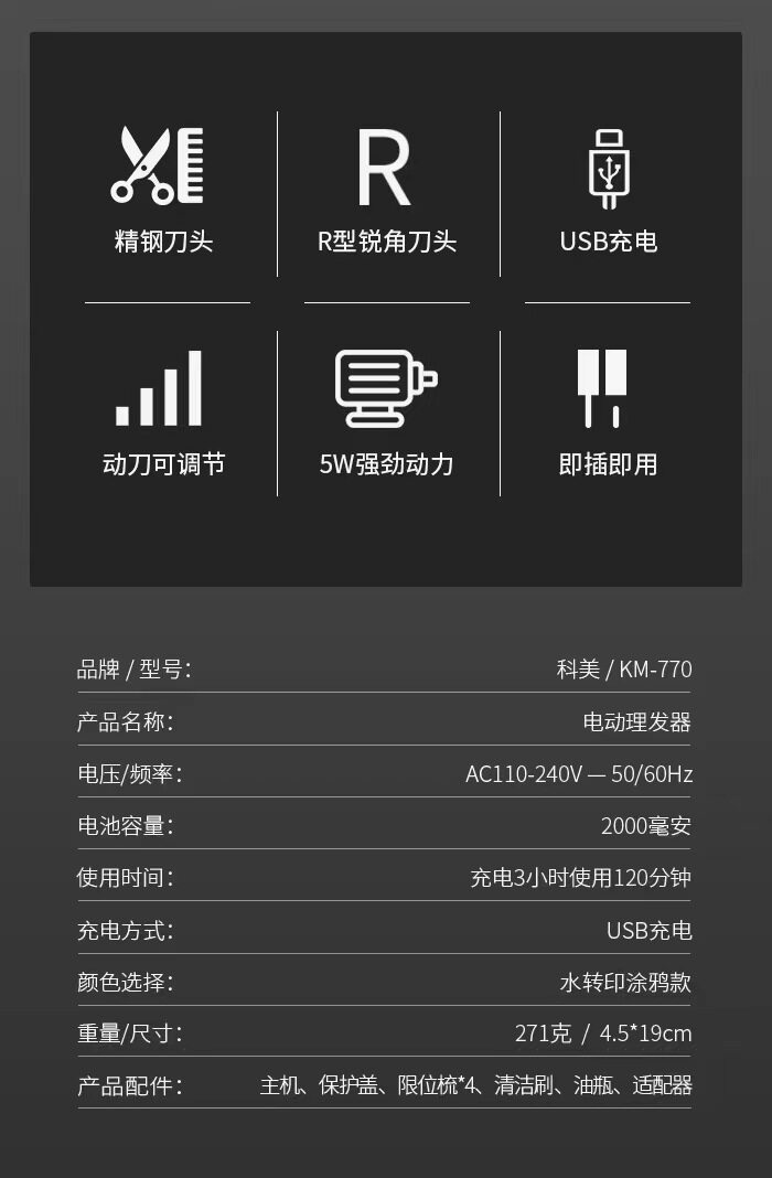 科美 Электрическая модная беззвучная машинка для стрижки волос с зарядкой для стрижки волос