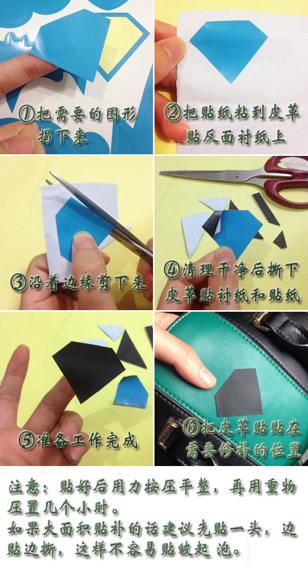 Небольшой магазин сопровождается шаблонами для пользователей, чтобы использовать DIY. Просто сорвать наклейки и наклеить наклейки на заднюю часть подкладки кожаной наклейки. Его можно вырезать из края наклейки. Вы можете прямо опубликовать его к позиции, которая должна быть отремонтирована.