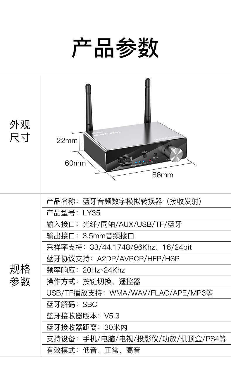 Аудиоприемник Bluetooth 5.3 поддерживает декодирование оптоволоконного коаксиального кабеля, беспроводной передатчик HiFi, аудиоаксессуары LY35