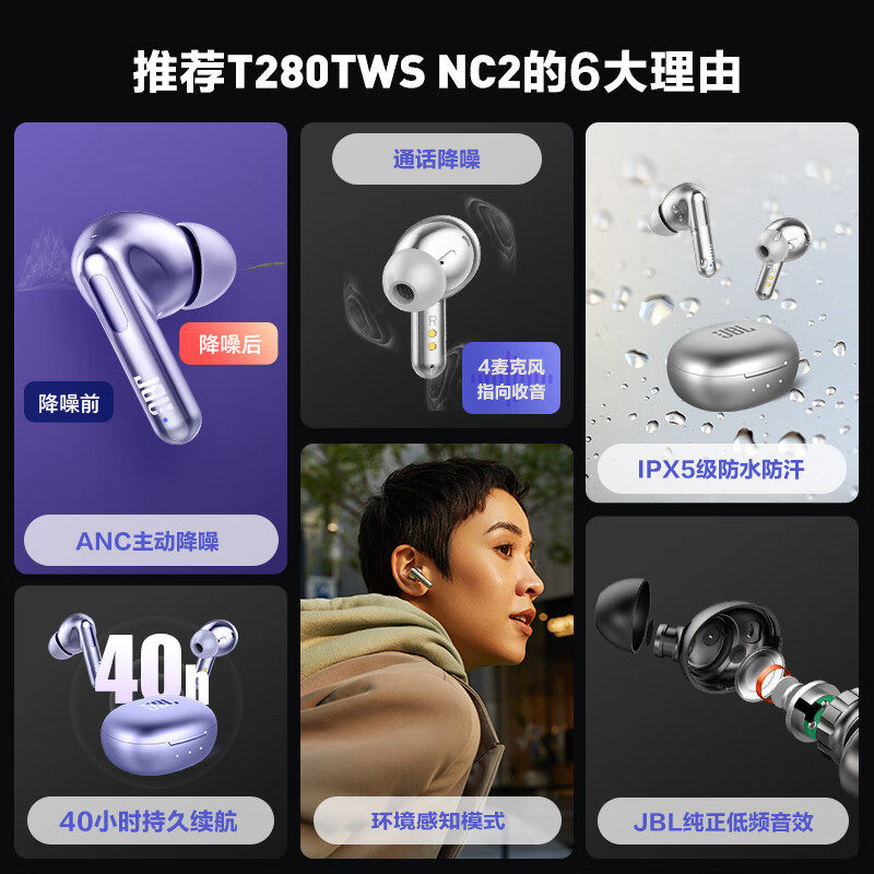 JBL T280TWS NC2 Реал беспроводной гарнитуры Bluetooth Активное снижение шума в спортивном вызове -