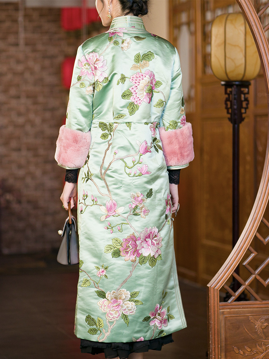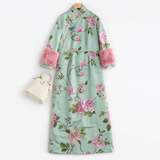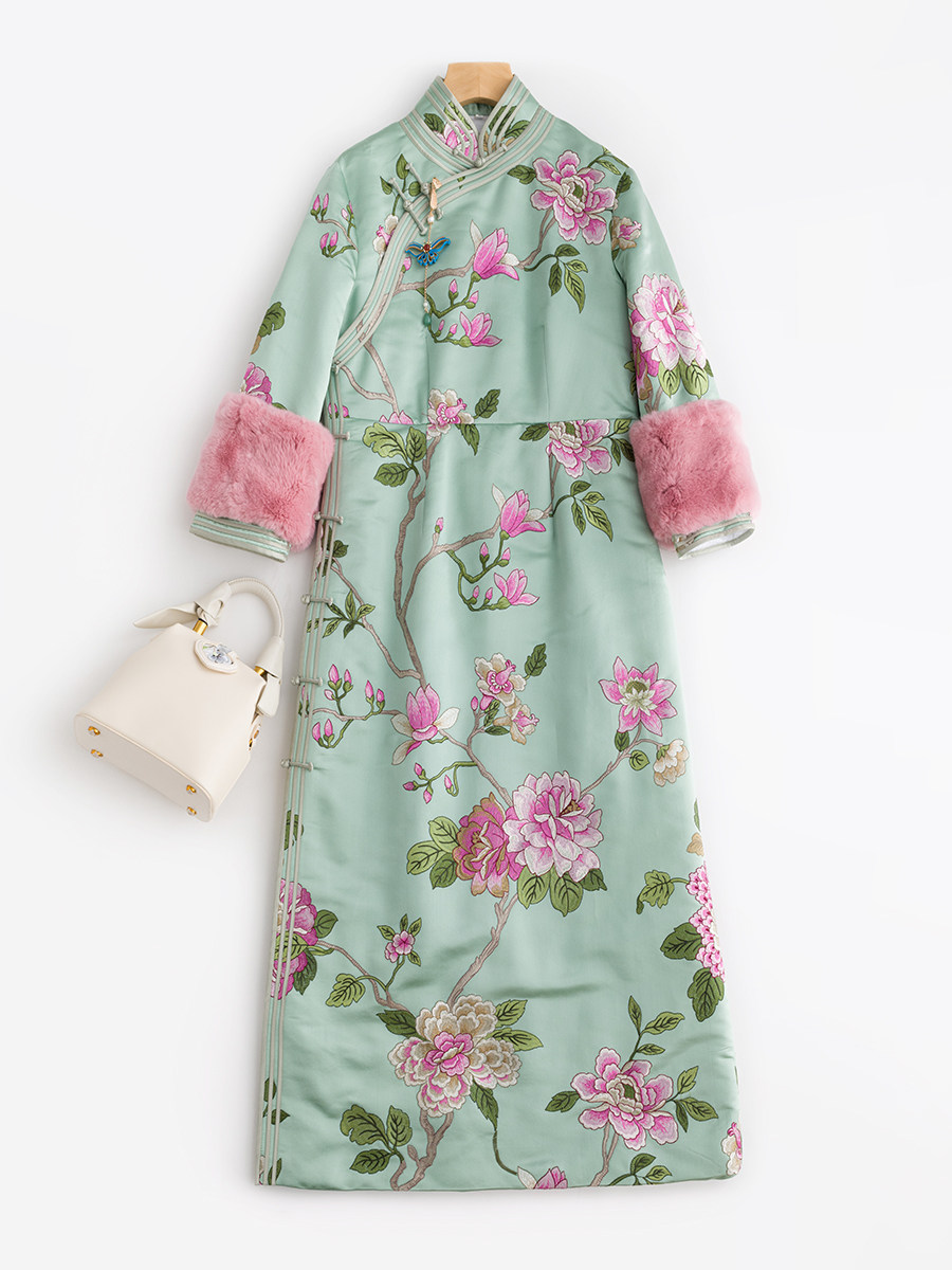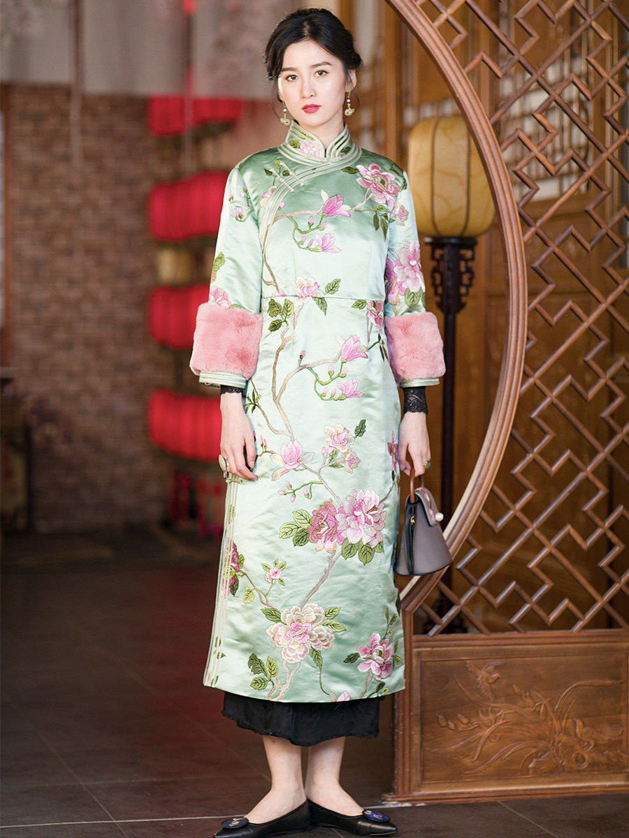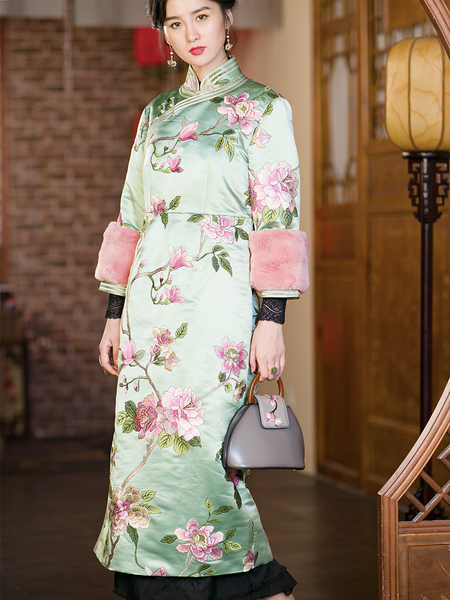 Демисезонное ретро платье, ципао, в цветочек, с вышивкой, облегающий крой