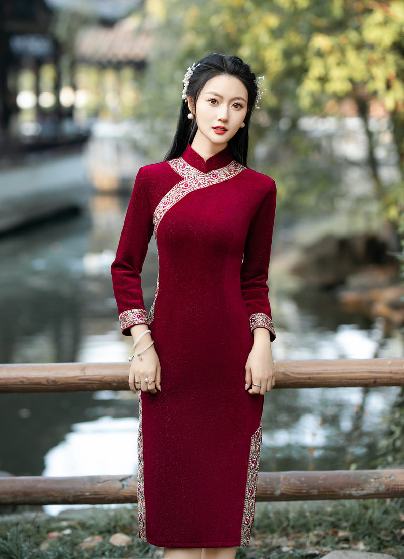 Этническое флисовое ретро свежее ципао, этнический стиль, с вышивкой, облегающий крой