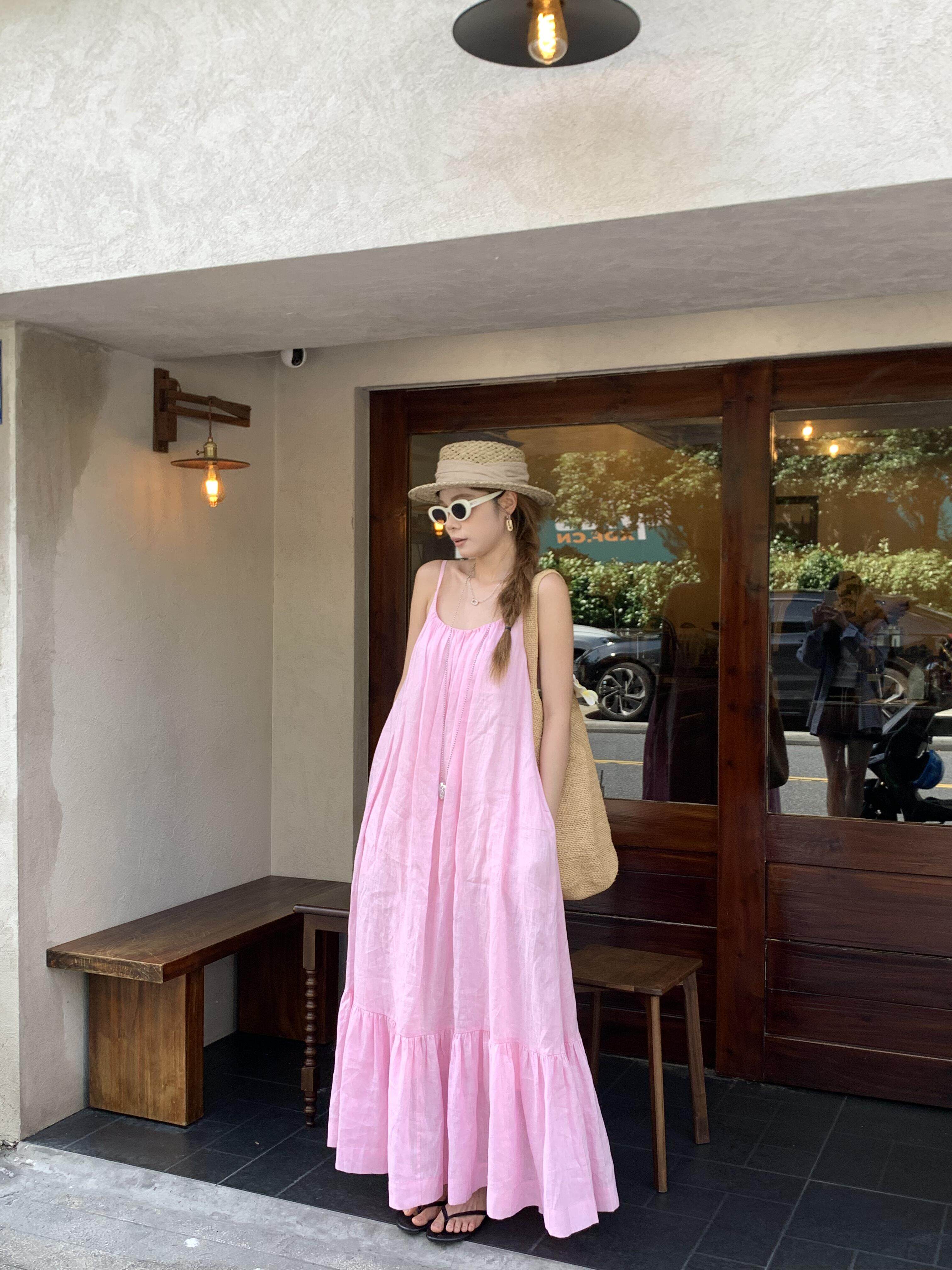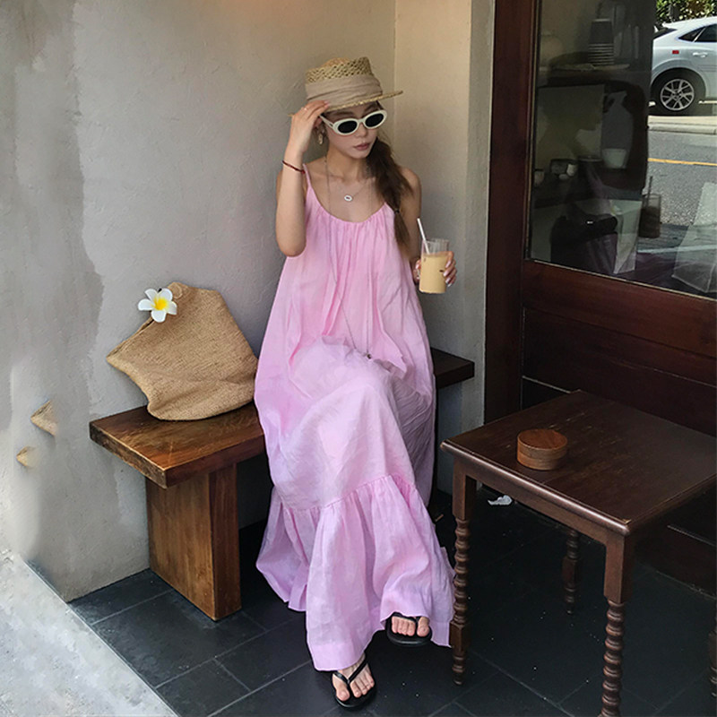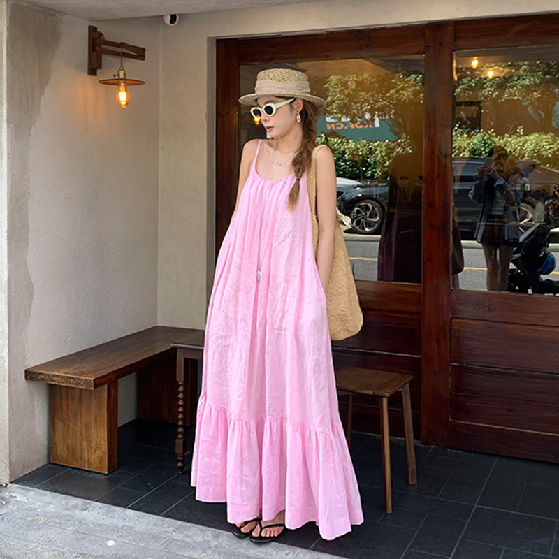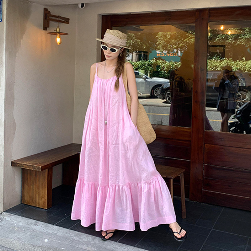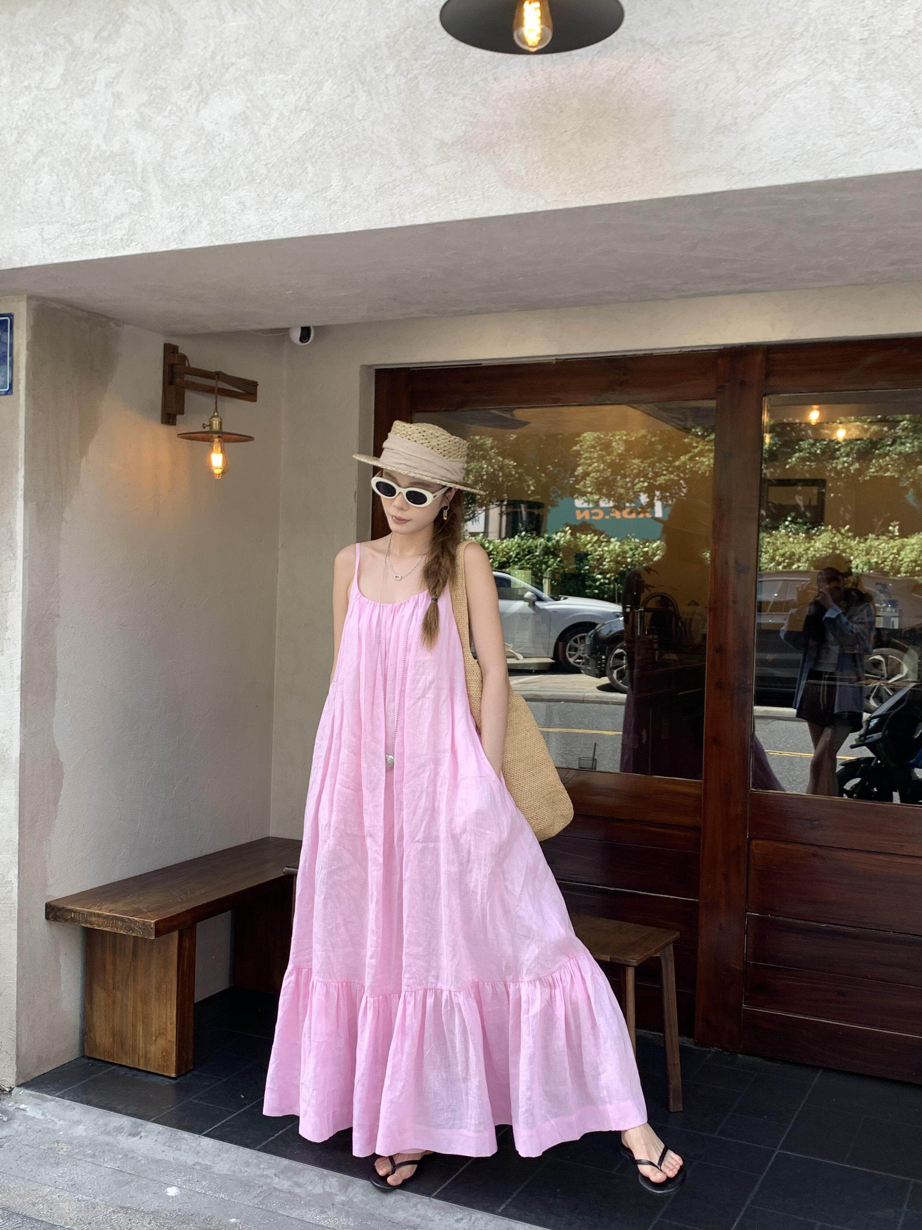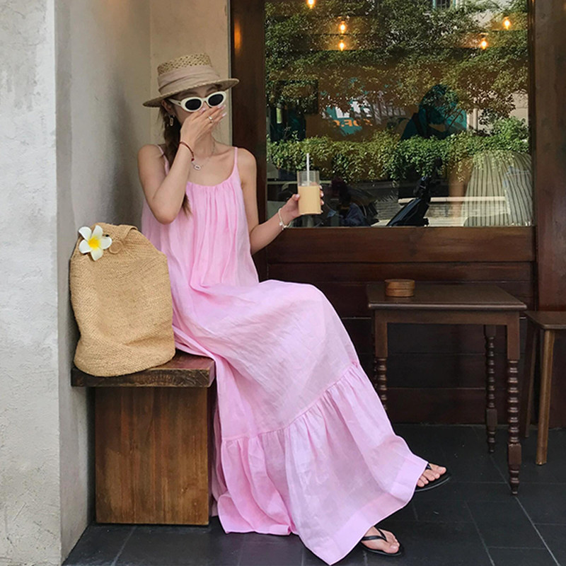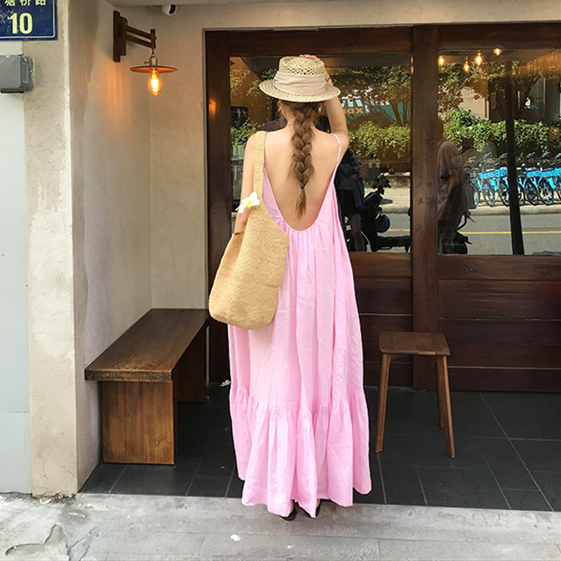 Розовая летняя длинная юбка, французский стиль, свободный крой, эффект подтяжки, с открытой спиной