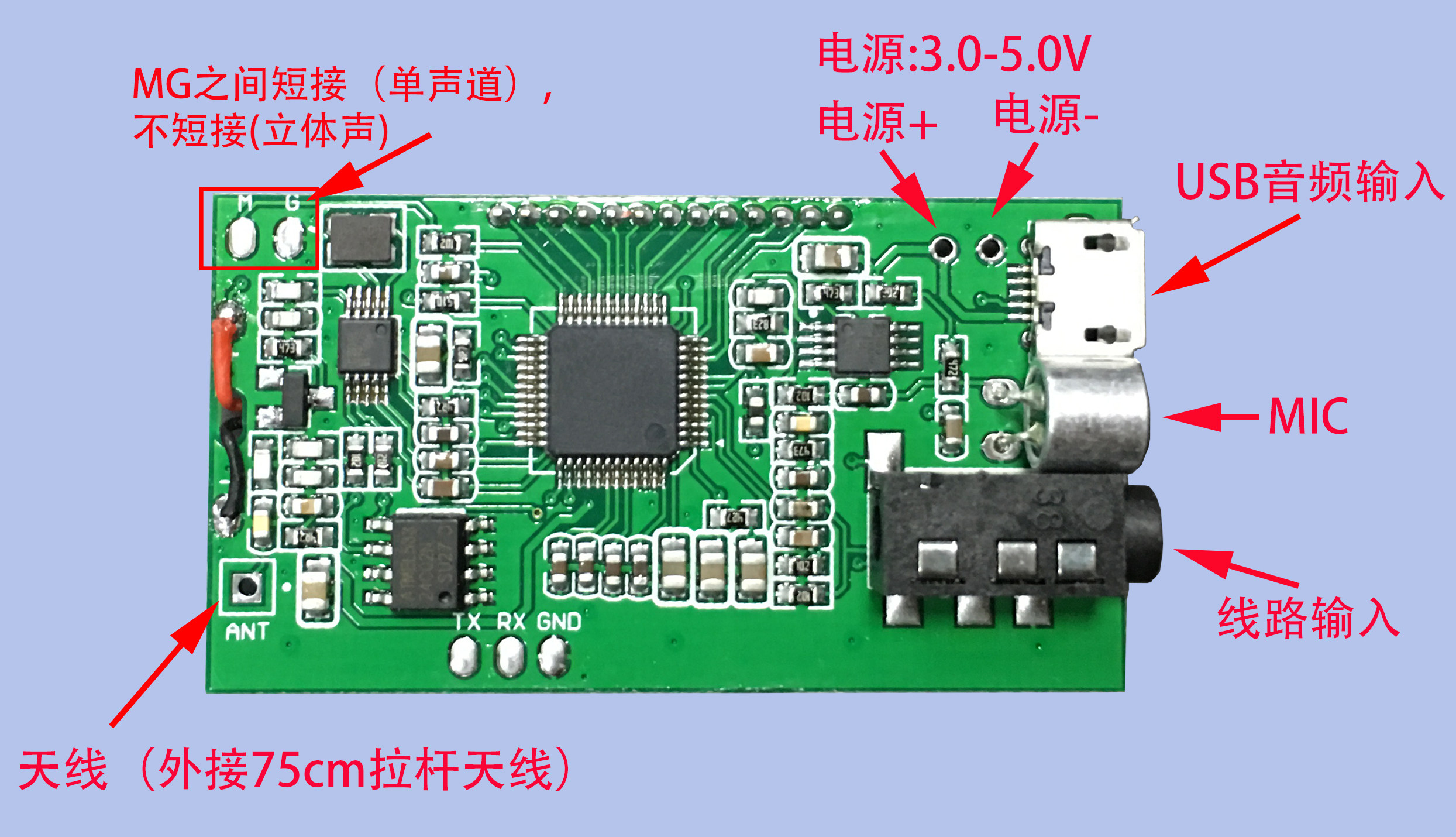 Порт муравья используется для подключения антенны FM, чтобы быть лучшеэмиссияFM -сигнал, рекомендуется подключить 75 -см длины антенны рычага, и нет никаких препятствий для препятствия, насколько это возможно, возле антенны.