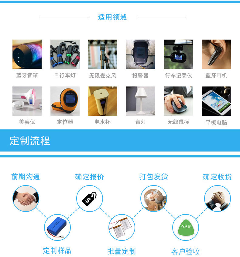 Мобильная мощность, автомобильная навигация,MP3, MP4 ,MP5 , карточные колонки, беспроводные мыши&бритва для бритья Мобильный телефон Xiaomi Экран дисплея PSPВстроенная батарея Периферийный блок питания Apple, планшетный компьютер, мобильный телефонDVD, аккумулятор ноутбука,Оборудование беспроводного мониторинга, Медицинское оборудование, Различныеприборы,LEDЛампы, дорожные знаки, портативная мелкая бытовая техника, электроинструменты, игрушечные машинки, различные инструменты DIY, металлодетекторы, авиация, железные дороги, военная промышленность и другие области.