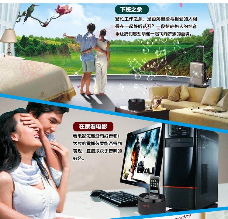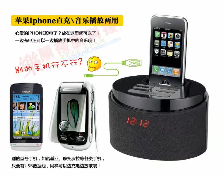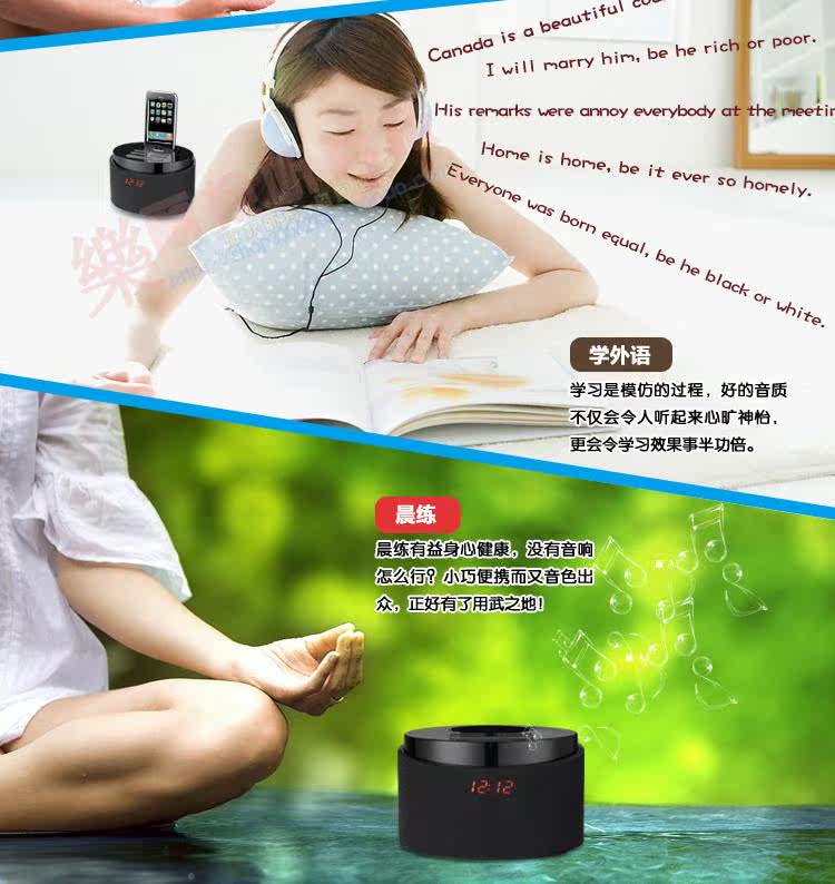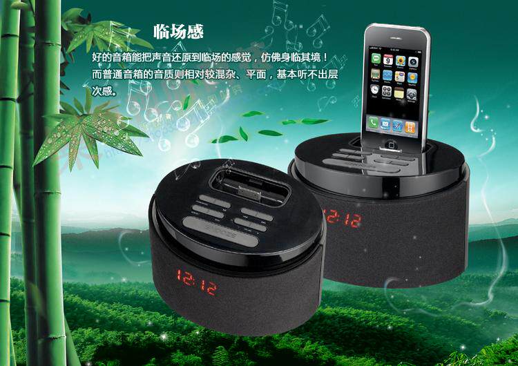 : : 是 一 款 iPod iPhone 苹果 播放器 , 并 可 对 苹果 充电 , 带 usb 、 Sd 插槽 , 播放 U 盘 或者 Sd 卡里 mp3 格式 , 带 aux 音频 输入 , 能 mp3Использовали мобильные телефоны, компьютерные динамики.FM -радио функция.