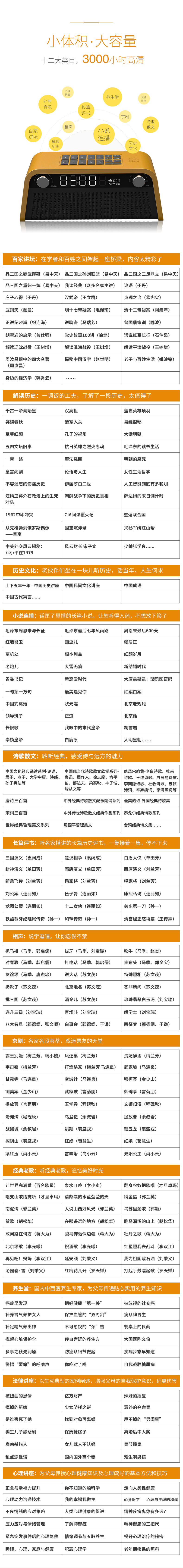 Он состоит из настольных динамиков Bluetooth и карты памяти 32G. Здравоохранение, залы здравоохранения и медицинские залы. Двенадцать основных категорий книг для слушания, таких как юридические лекции, имеют в общей сложности 3000 часов классического высококачественного звука.Кроме того, с функциями регулировки частоты беспроводной Bluetooth и FM.