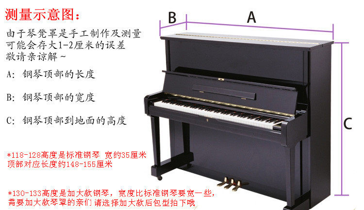 Обычная модель – фортепиано.Тип 118-126Универсальный! Более крупная модель — фортепиано 130-131.Проходитьиспользовать Пожалуйста, сравните размер вашего пианино, прежде чем сделать фотографию~(Пожалуйста, имейте в виду, что, поскольку это универсальный размер, наш чехол для пианино может быть накрыт, но он не сможет полностью закрыть нижнюю часть пианино. Высота каждого пианино разная, поэтому разница в длине чехла в несколько сантиметров является нормой)(Если вам нужно вернуть или обменять товар, потому что вы взяли неправильный размер, вы будете нести ответственность за стоимость обратной доставки. По таким причинам, как яркость фотографии и разрешение компьютера, фактическая разница в цвете продукта является нормальным явлением. Если вы не возражаете, пожалуйста, будьте осторожны при фотографировании)