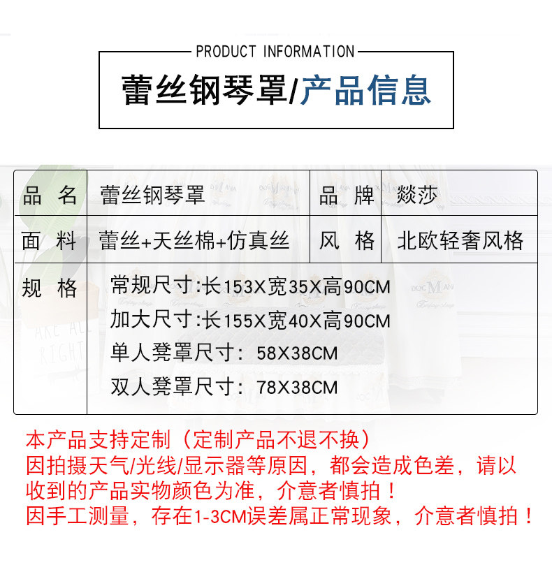 | Технические характеристики: | Обычный размер+одноразовый стул (58*38 см), Обычный размер+двойной стул (78*38 см), Увеличение размера+одноразовая крышка стула (58*38 см), Увеличение размера+двойная крышка стула (78*38 см), Обычный пианино -капюшон (исключая крышку стула), Увеличьте фортепианную капюшону (исключая крышку стула), 58×38см, 78×38см |