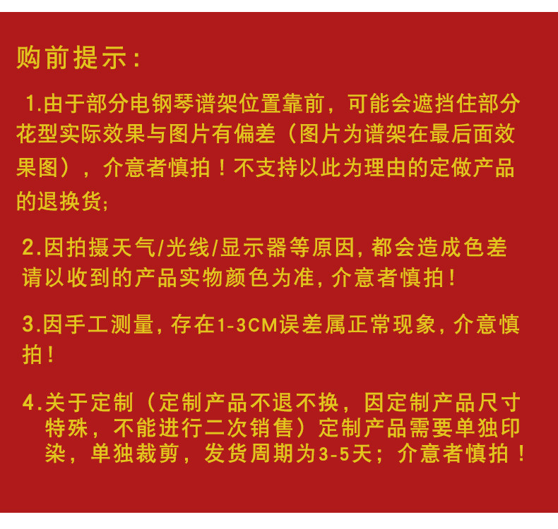 | Технические характеристики: | 61 Ключевая крышка фортепиано 96*40 см. Нежелание полки, 61 Ключевая крышка для фортепиано 96*40 см тибетской крышки, 134×30см, 134×30см, Yamaha P125/P128 (спектр 62*21), Yamaha P95/P85 (Spectrum 70*23), Индивидуальная Yamaha YDP103/142/143/144, Индивидуальный Yamaha YDP162/163 (исключая наводнение стула), Крышка 140*50 без крышки спектра, Индивидуальная электрическая наполовину крышка для фортепиано+крышка для одного стула, Индивидуальный синтезатор для двоих, Индивидуальная полная крышка для электрического пианино (за исключением крышки стула), Настраиваемые двойные клавиши (исключая крышку стула), Настраиваемая двойная клавиша для клавиши+стула., 58×38см, 60×30см, 78×38см, Roland FP30 |
