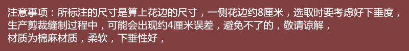 | Технические характеристики: | 60*60 см (включая кружево), 70*70см (тумбочка/шкаф для кондиционера и т. д.), 85*85 см (один холодильник/стиральная машина/маленький столик), 105*105 см (маленький круглый стол/телевизор/квадратный стол), 125*125 см (ТВ/квадратный стол/круглый стол), 145*145 см (ТВ/квадратный стол/круглый стол), 105*155см (обычный журнальный столик), 125*175 см (обычный обеденный стол/большой журнальный столик), 195*145см (большой обеденный стол), 150 см (круглый), 180 см (круглый), 200 см (круглый) |