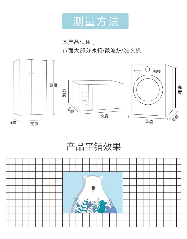 | Технические характеристики: | 35*100 см (крышка микроволновой печи), 40*105 см (крышка микроволновой печи), 45*130 см (крышка микроволновой печи), 50*130 см (маленький и средний холодильник/стиральная машина), 55*135 см (однодверный холодильник/стиральная машина), 60*150 см (маленький двухдверный холодильник/стиральная машина), 65*170 см (двухдверный холодильник/стиральная машина), 70*180 см (двухдверный холодильник/стиральная машина) |