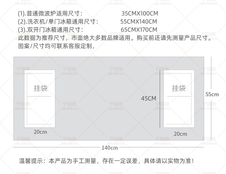 | Технические характеристики: | Индивидуальный размер, пожалуйста, свяжитесь с обслуживанием клиентов, 35x100 см [микроволновая печь], 45x130 см [малая стиральная машина холодильника], 50x130см [малая стиральная машина холодильника], 55x140см [стиральная машина холодильника], 60x140 см [маленький двойной дверной холодильник/стиральная машина], 60x170 см [двойной холодильник], 70x170cm 【двойной двойной открытый иллюстрация】 |