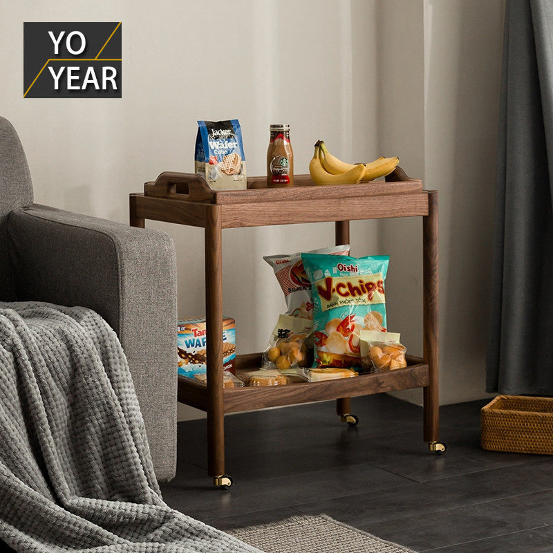Средний легкий роскошный диван -диван диван -диван рядом с несколькими черными деревянными тележками из орехового ореха китайский современный мобильный кофейный столик с твердым деревом Cart