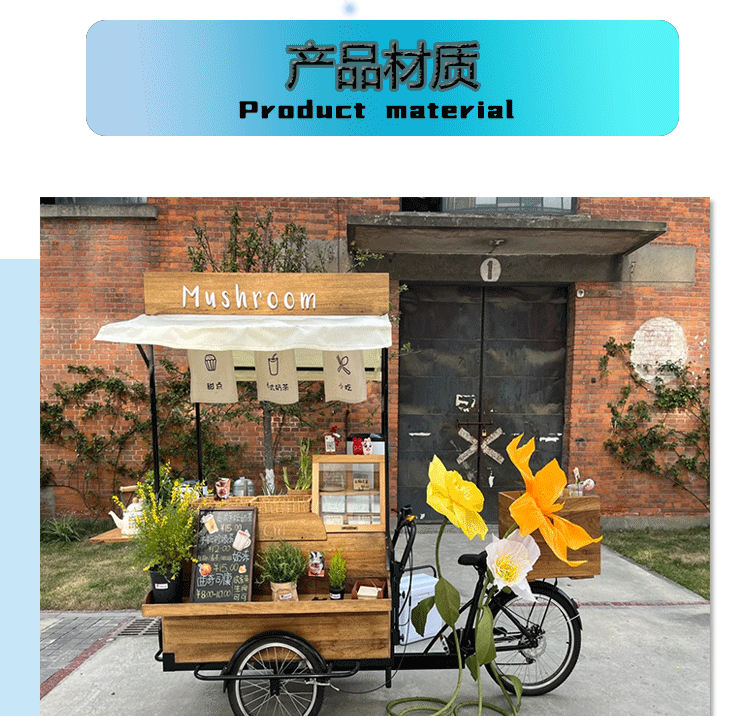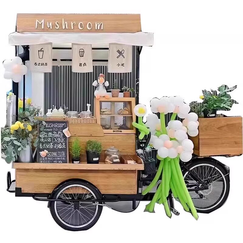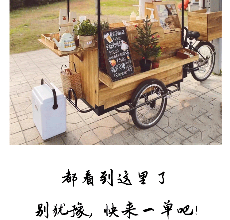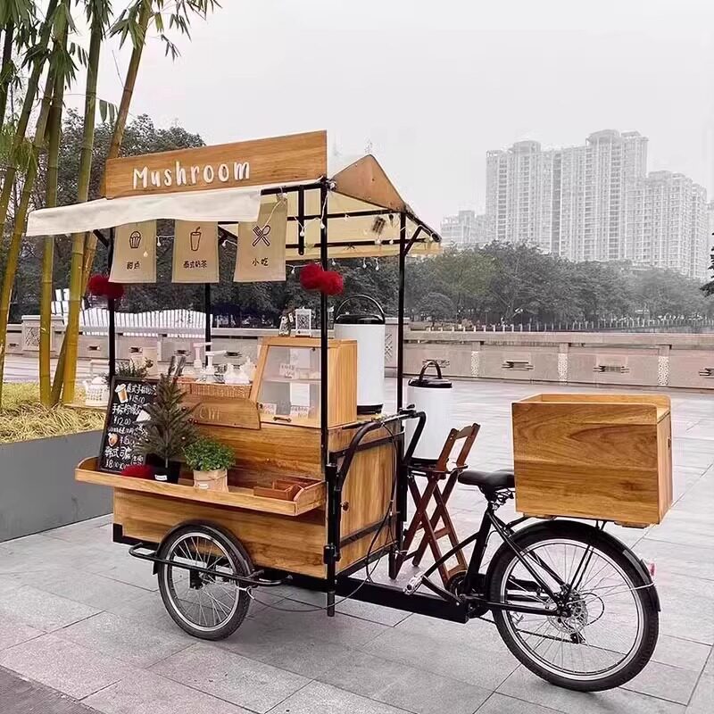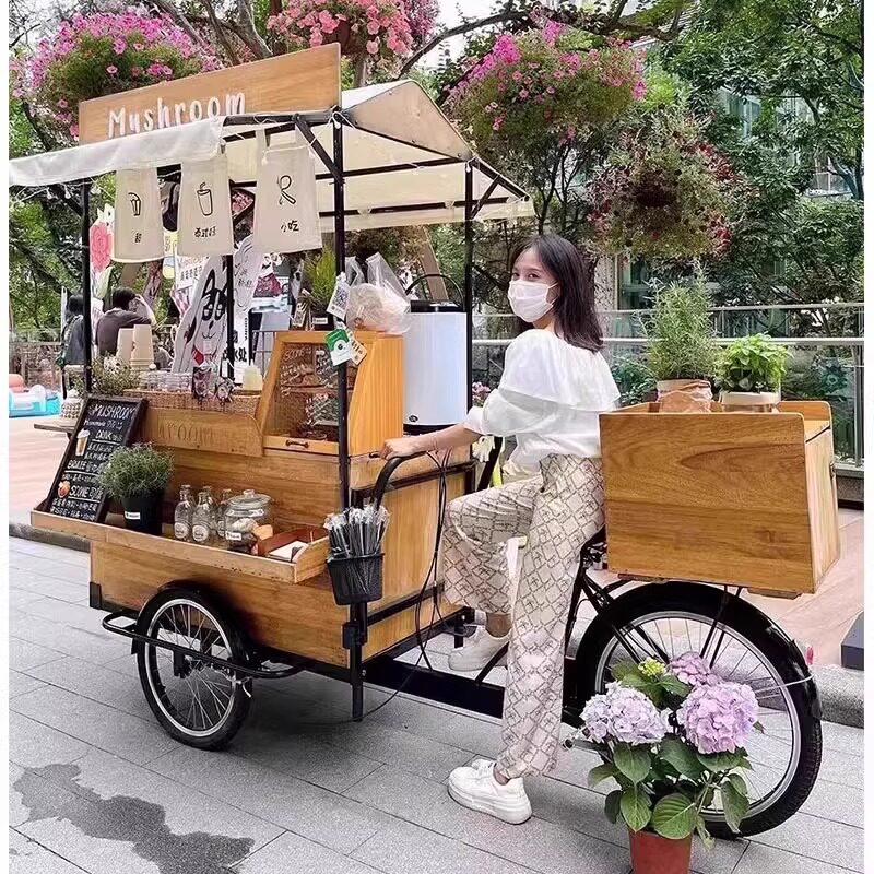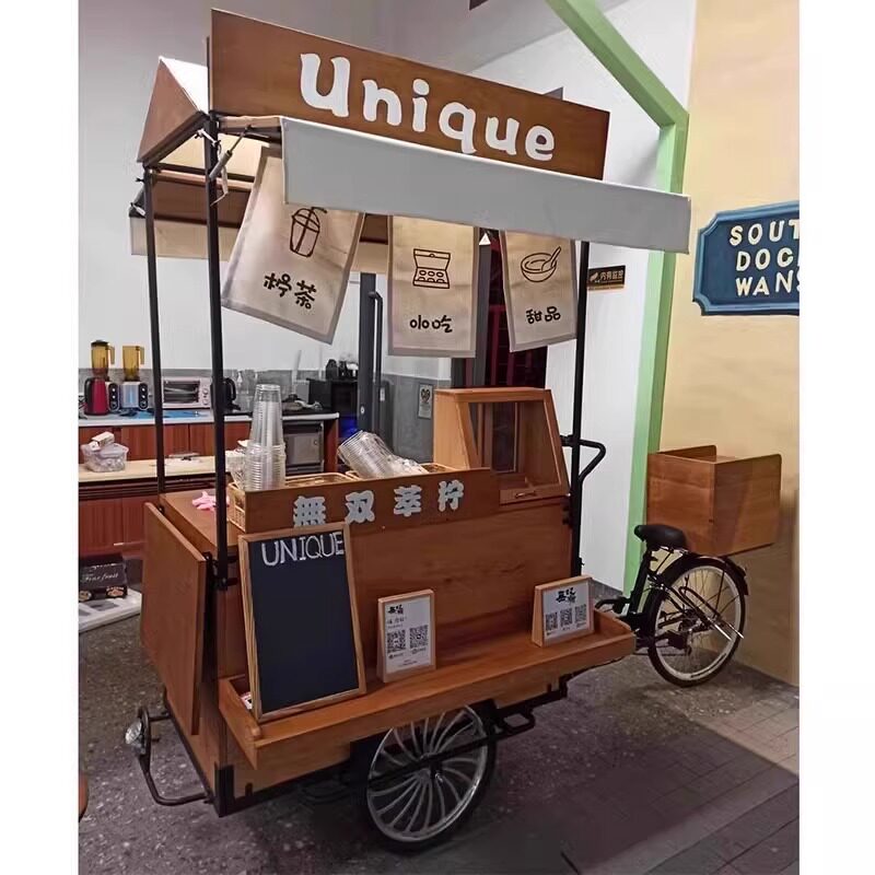 Американская антикварная мобильная трехколесная тележка для кофе из цельного дерева, обеденная тележка, рекламный киоск торгового центра, тележка для показа живописных мест ночного рынка