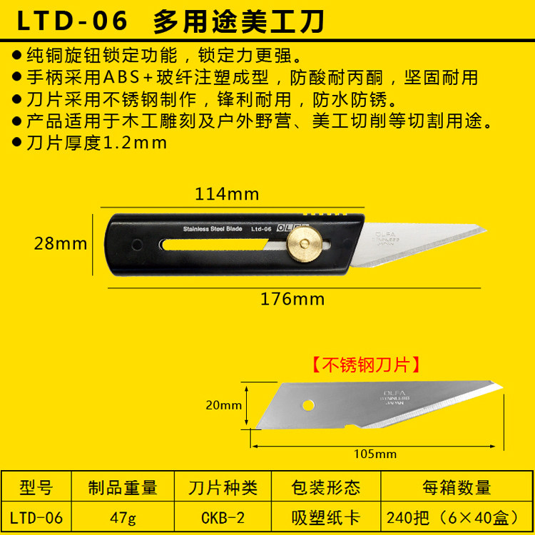 - LTD-06: Усовершенствованная инженерная пластиковая ручка, удобная ощущение сцепления, лезвия из нержавеющей стали, толщина 1,2 мм, может адаптироваться к различным средам, водонепроницаемой и ржавчине.