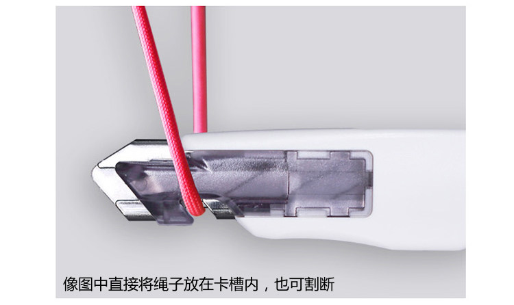 Не нужно выдвигать лезвие, положите веревку в слот для карты, чтобы безопасно и точно разрезать веревку.