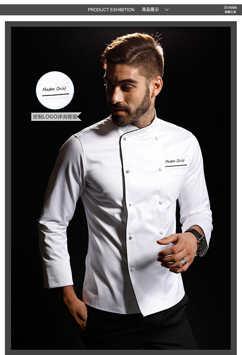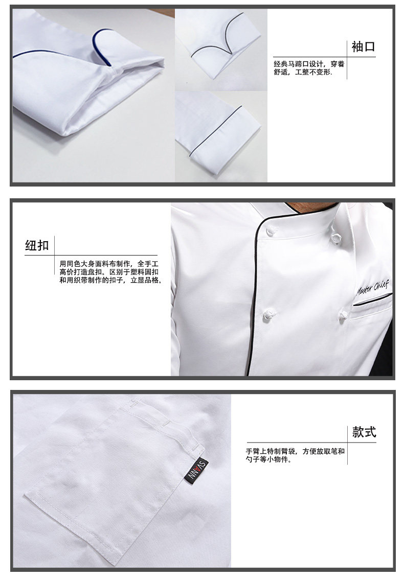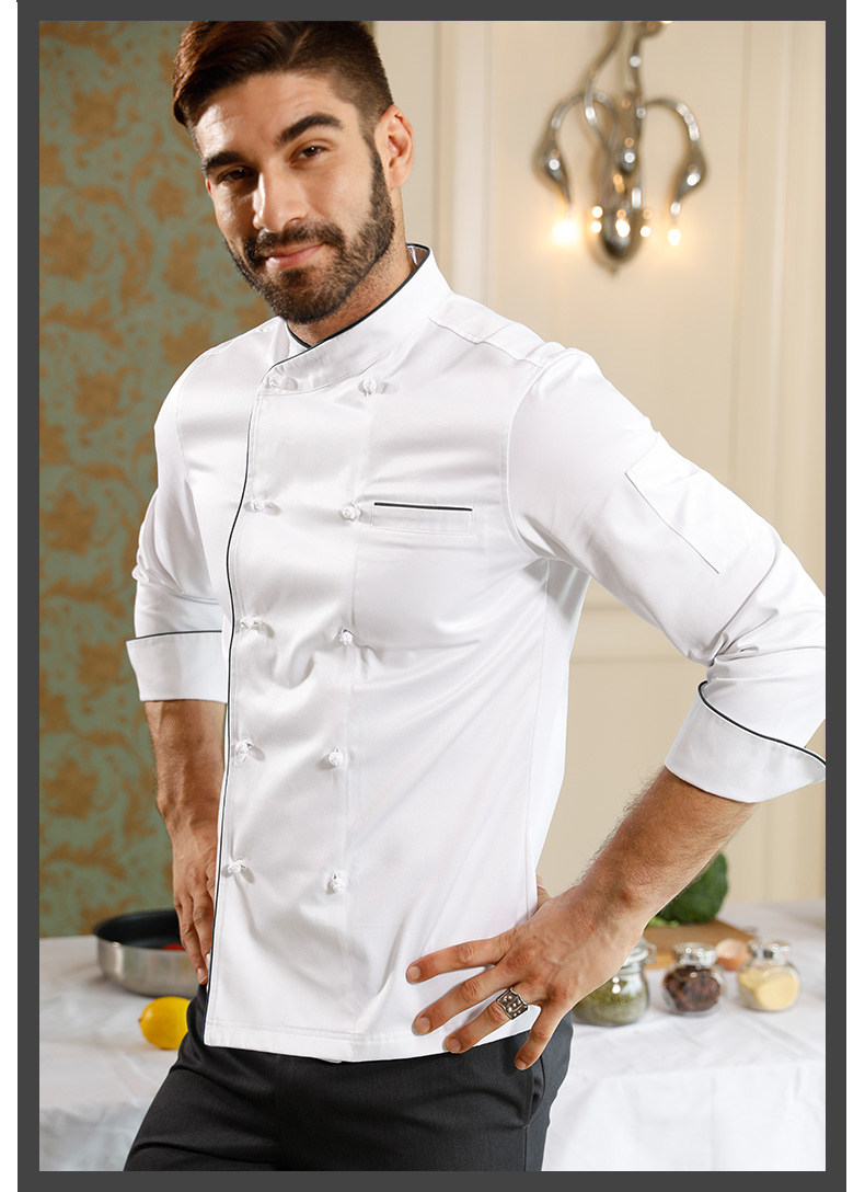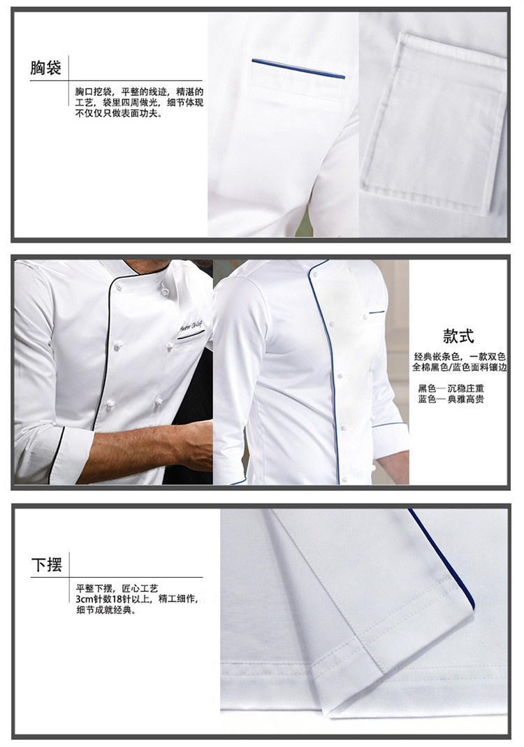 Униформа шеф-повара с синими краями, двухрядная пряжка ручной работы, униформа шеф-повара от кутюр из высококачественного хлопка с индивидуальной вышивкой.
