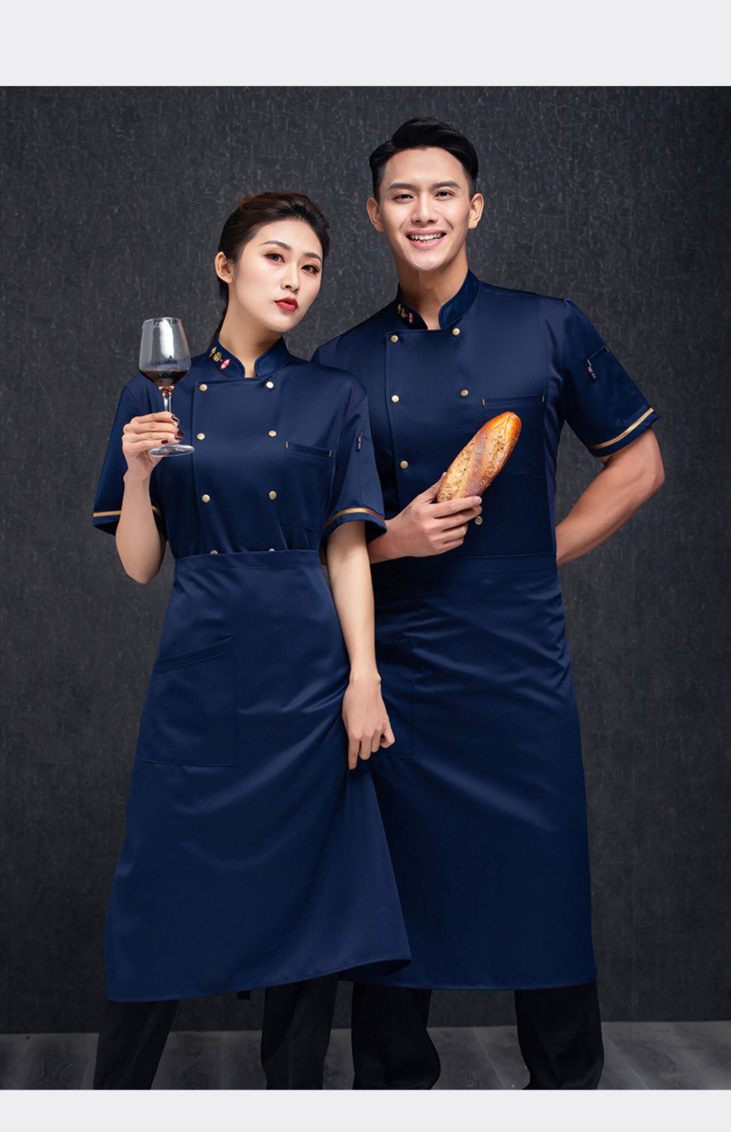 - Синий фартук, короткий рукав