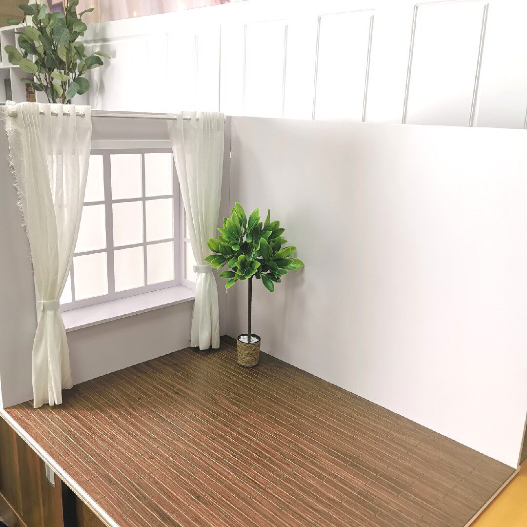 Цена представляет собой набор сцен детского дома, в том числе 1 эр -окна, 1 -сильную стену, коричневый пол, шторы, за исключением мебели и бонсай растений и декоративных украшений на картинке.