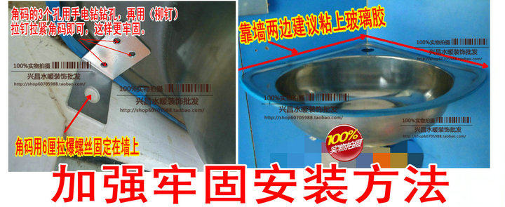 [安装说明:角码的作用是托住三角盆,靠墙两边建议打玻璃胶,或者用拉钉(][铆钉][)直接拉紧即可。]