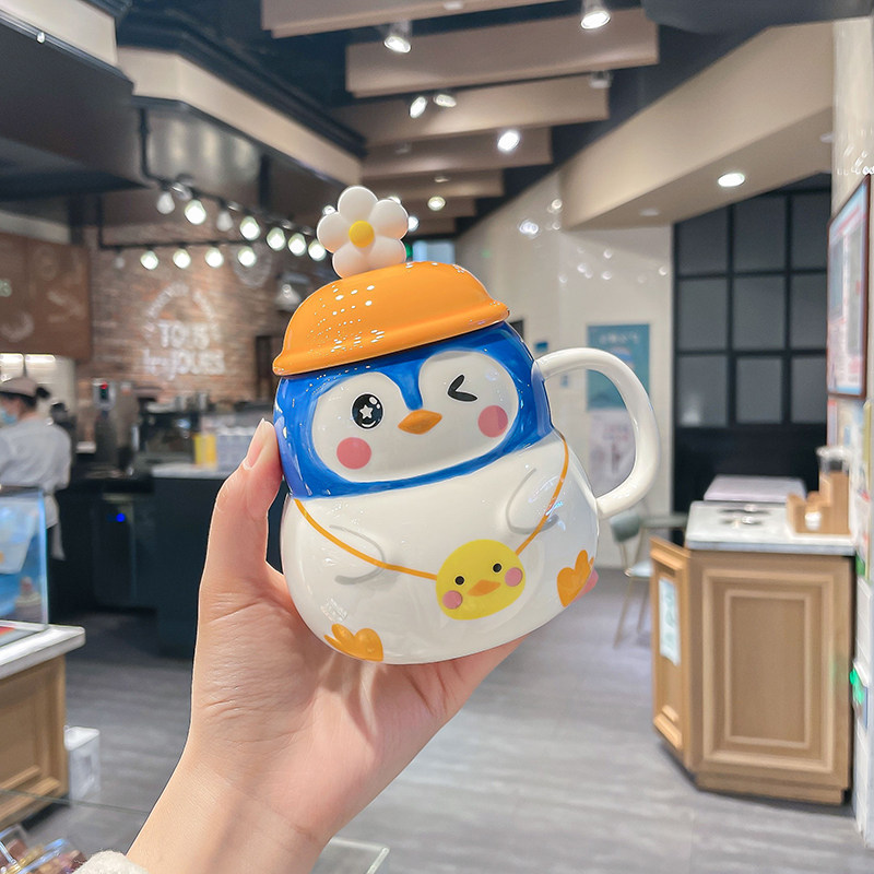 Глупая пингвин Марк Кубок Девушка Симпатичная мультипликационная карикатура -керамическая чашка офиса с крышкой с ложкой с творческой чашкой для воды