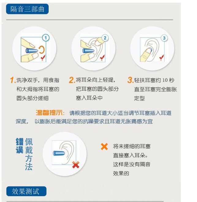 [Как использовать]: 1. Вымойте руки и потрите затычки для ушей между большим и указательным пальцем как можно более тонкими.2. Потяните другое ухо вверх из -за головы одной рукой, потяните ушной канал и используйте одну руку, чтобы втирать тонкую часть ушной пробки в ушной канал, оставив часть ушной пробки за пределами ушного канала для легкого удаления.3. Прижимайте пальцы к ушной пробке (около 10 секунд), пока она не расширит и не подходит для ушного канала.
