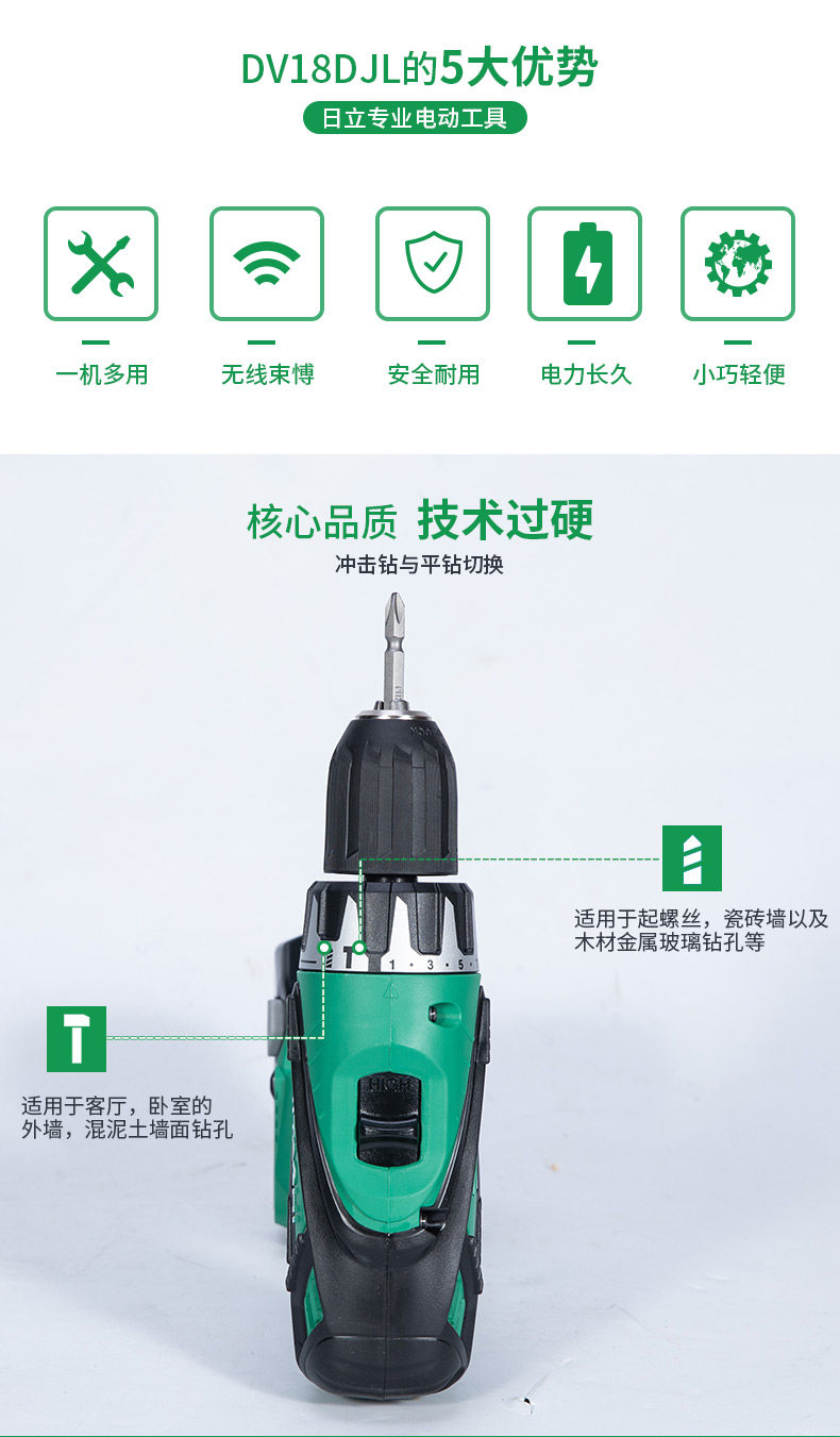 Hitachi Hitachi Drill Dv18djl Strike Drilling Электрическая отвертка Пистолетный бурение