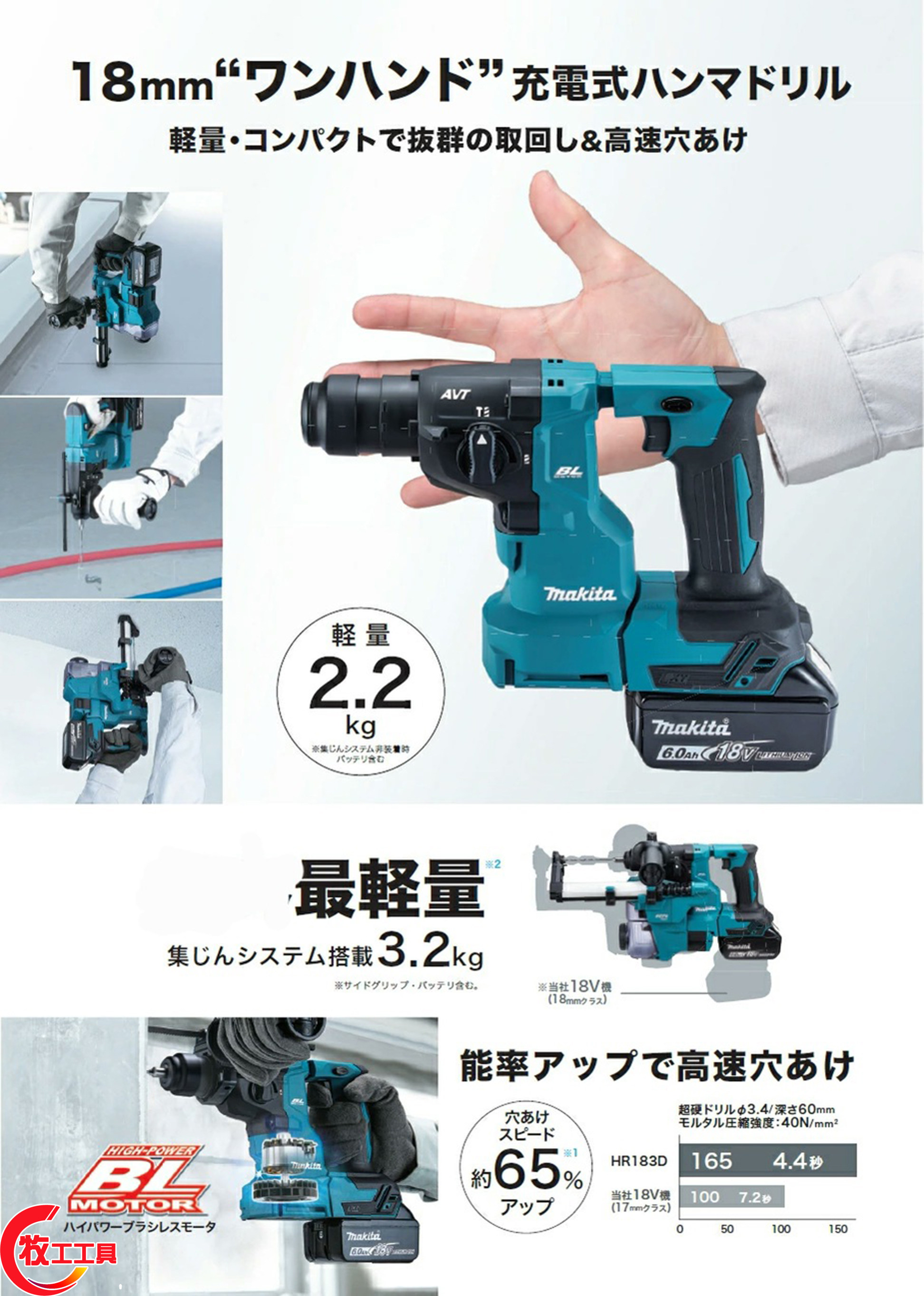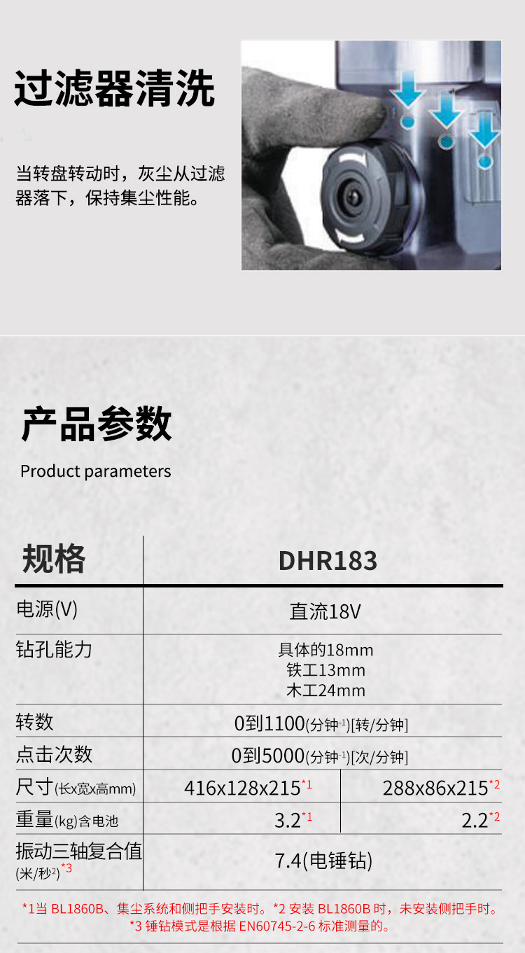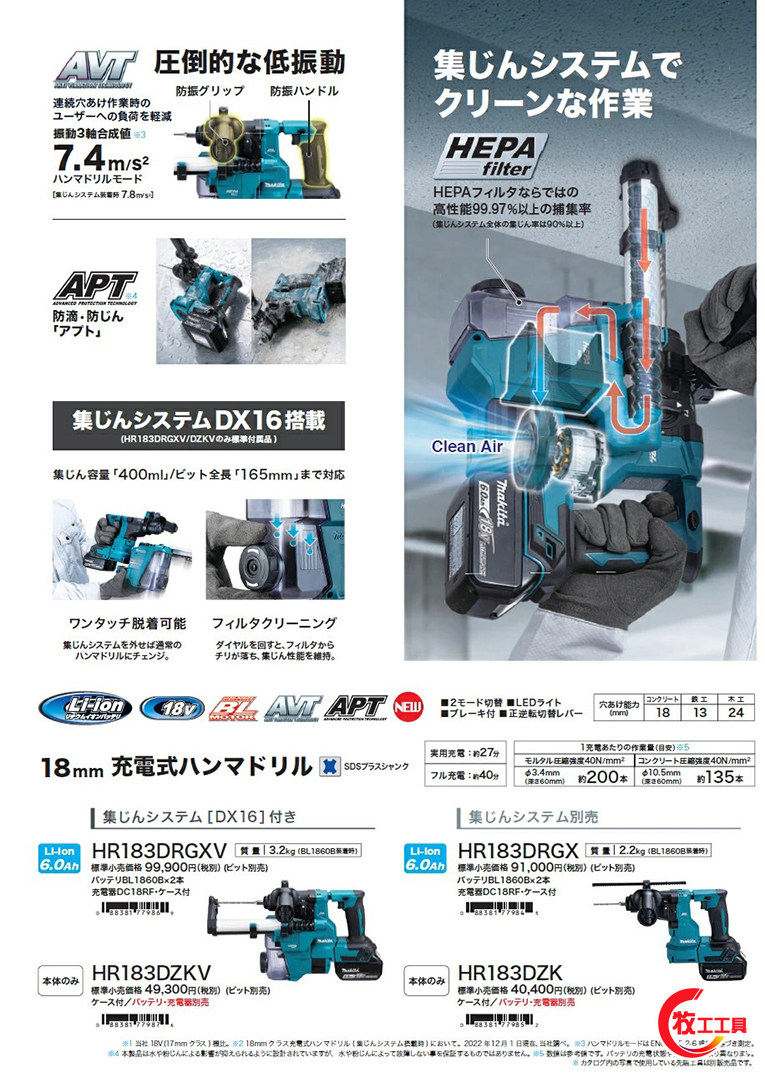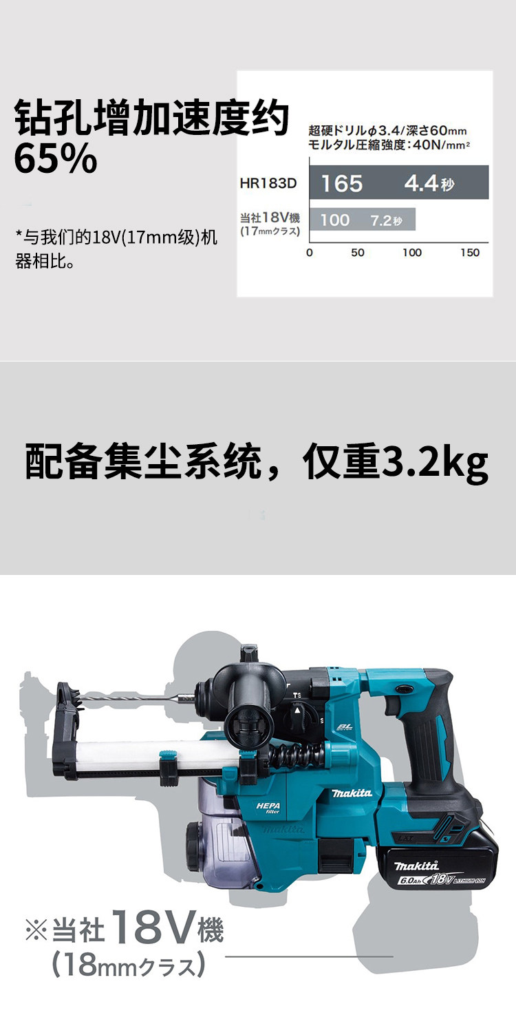 Японский макада HR183 Электрический молоток Новый DHR182 Strike Drill 18V Lithium спокойный пылевой пыль буровые