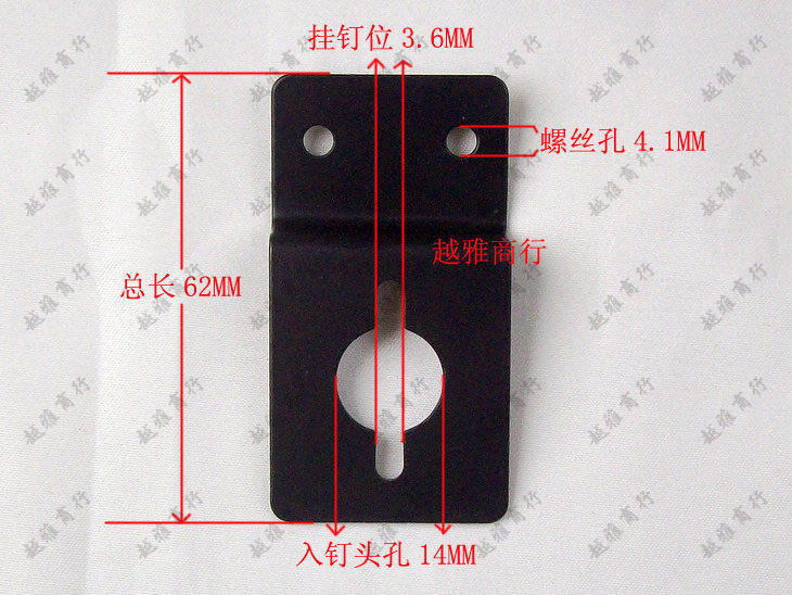Размер: длиной 62 мм, шириной 33 мм, толщиной 1 мм, 1 мм толщины железа; Центральная точка расстояния двух фиксированных отверстий для винта составляет 20 мм, максимальная ручка винта 4 мм, максимальная крышка для винта не ограничена, максимальная средняя ручка вешалки составляет 3,6 мм, а максимальный средний вход вешалки составляет 14 мм.