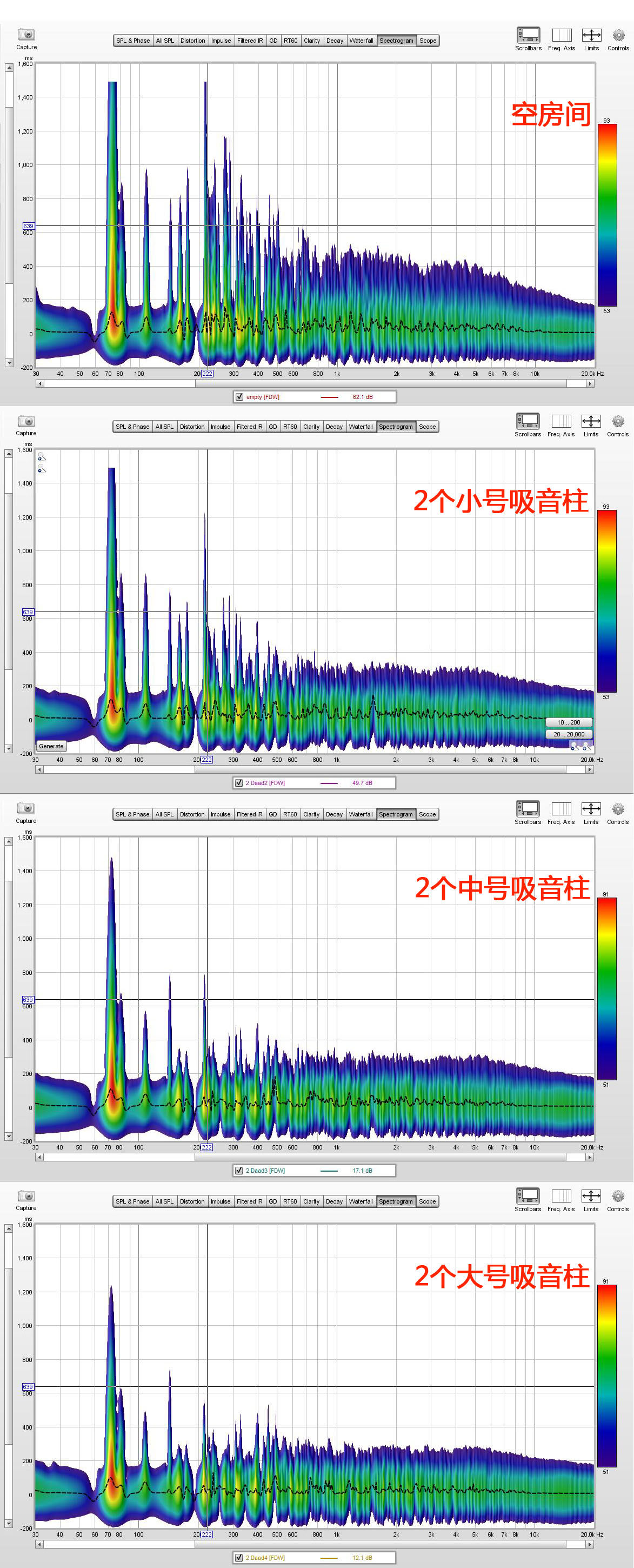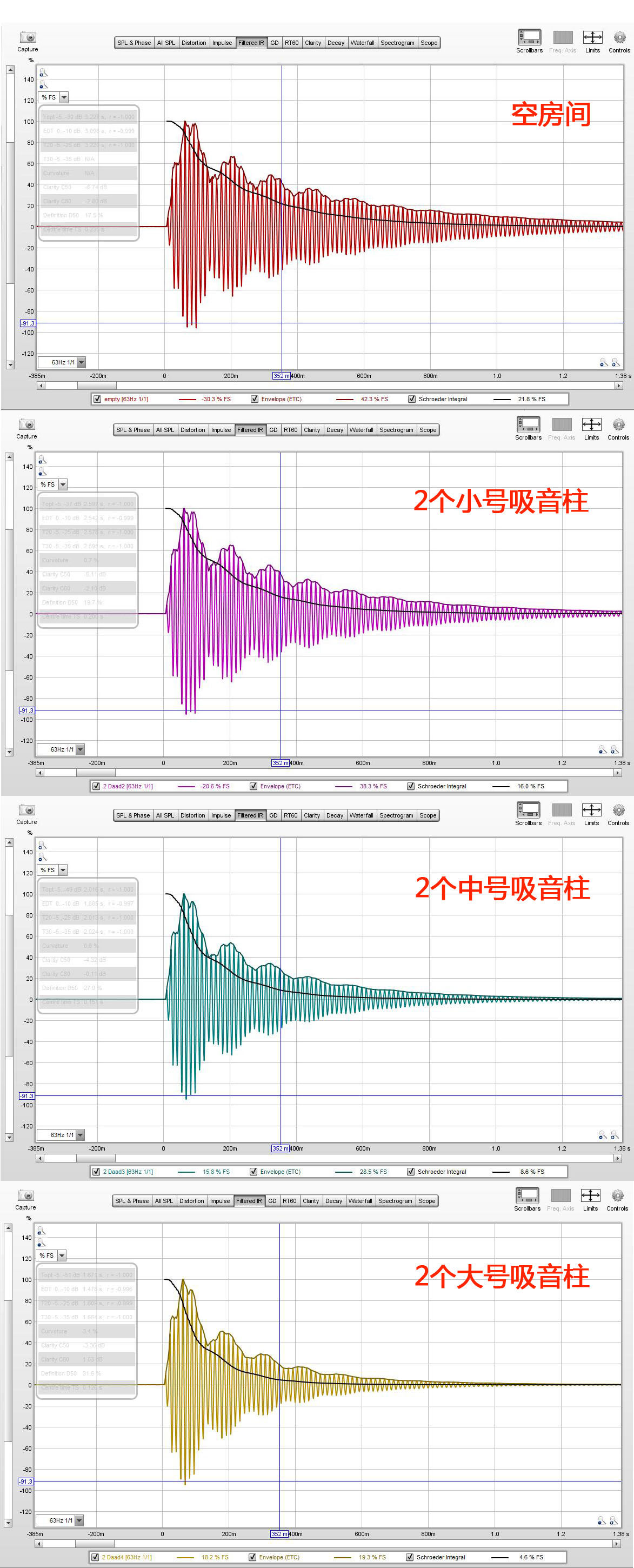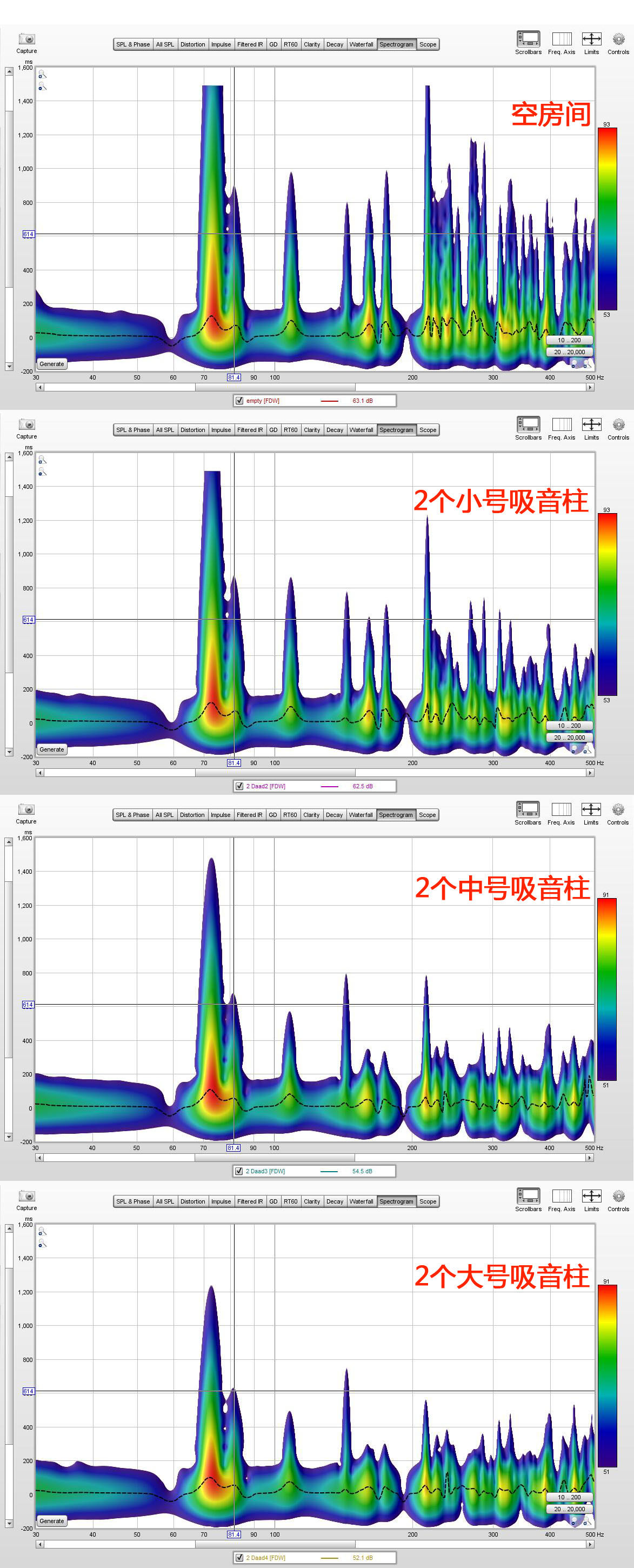 1) На этой сравнительной диаграмме показано время реверберации и амплитуда басового сигнала частотой 63 Гц в комнате.Видно, что после использования средних и больших звукопоглощающих колонок время реверберации баса в помещении значительно сокращается.