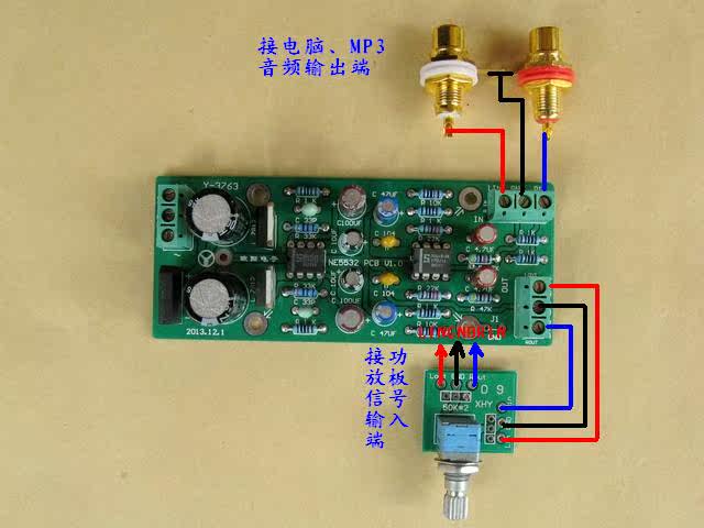 2. Эта передняя плата должна быть подключена к потенциометру, чтобы отрегулировать объем. Потенциометр подключен в середине выходного конца NE5532 и входной клеммы сигнала усилителя.
