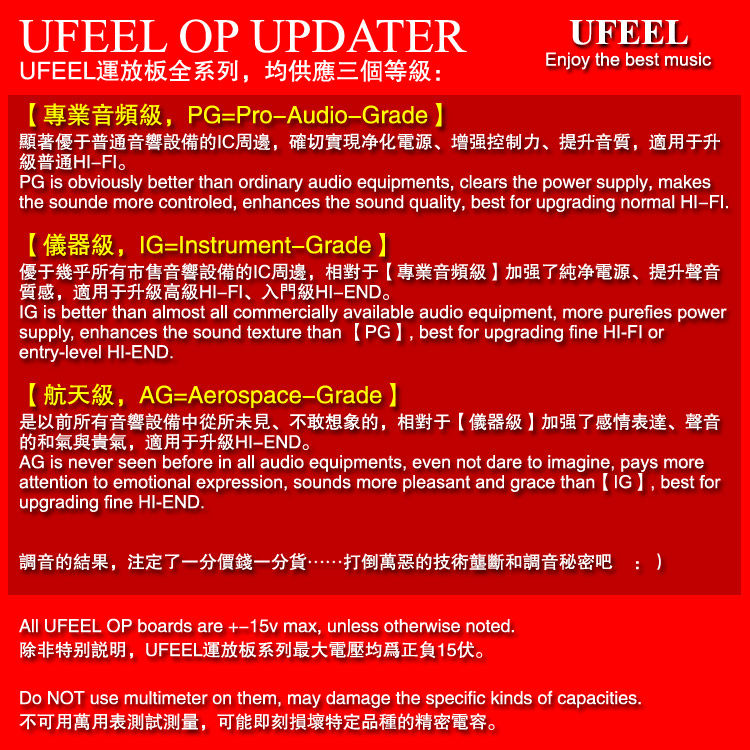 Строго говоря, Super, Dream-Op и Big-Op Series от Ufeel являются независимыми [Territories+Cushion+Audio модуль обновления). Из-за полного эквивалента стандартного OP AMP он может напрямую заменить использование обычного OP-AMP, так что он оправдан, это называется OP AMP. Super, Dream-Op, Big-Op Series может напрямую дать полную игру высококачественному и хорошим звукам на обычных аудио-машинах. По сравнению с от одиночек-до двух и двух методов транспортировки мономера, двухсеть двух мономеров может Будьте обновлены. Длина линии обратной связи сокращается на 50%~ 80%, а последовательность и стабильность выше. Операции и игра столь же просты, как обычный OP AMP. (Для получения подробной информации, технических деталей, пожалуйста, обратитесь к «серии, модели и функции,« модели и функции Ufeel »:http://www.UFEEL.hk/uou.pdf Полем Super Series является точным эталонным объектом для обновления OP -AMP, соответствующего OPA627 Super627 и Super2627, эквивалентным двойным усилителям OPA627, Super797, соответствующим AD797 и супер2797, эквивалентным AD797 Double Op AMP. Super627 и Super797 обновляются с двойной транспортировки до одной операции, по крайней мере, в подавляющем большинстве аудио -машин, а OPA627 и AD797 независимо от Bo Zhong; Super2627, Super2797 модернизируются с четырех спада дано, чтобы дать ему. Удобство двойного операционного усилителя пользовалось OPA627 и AD797. Размер Super Series такой же, как и у одного усилителя DIP-8. Альтернатива AEROSPACE), как OPA627 AP/BP, как PG (Professional Audio Level), а также opa627 AP/BP. , AM/ различия между BM и SM, или различия между одним и тем же типом пластикового уплотнения, керамики и золотых уплотнений. Dream-Op, Big-Op-это почти новый обновление буфера в стиле звука, и на рынке нет единых OP-усилителей. Dream-op обеспечивает производительность флагманского операционного усилителя. На основании этого он создает качество звука на уровне мечты и хороший звук подписи Ufeel. Такая близость, естественность, атмосфера, гармония и благородный дух-все это выбор мечты. звуковых приложений. Версия Dream-Op Supply Gold (Toron PCB Shen Gold Circle) и серебряная версия обновляются до двух операционного усилителя в четвертый транспорт. 8 Территории одинаковы. Область проекции серии Big-Op составляет 14x12 мм, что издает более богатые звуки с площадью печатной платы в 2 раза превышающей ПХБ обычного операционного усилителя (10x8 мм), а контакты такие же, как обычный операционный усилитель. Big-OP01 модернизируется с четырех транспортировки с узким телом до двойного операционного усилителя, Big-OP02 модернизируется с широкого спектра широких тел до двойного OP AMP, All Supply PG (профессиональный уровень звука), IG (уровень инструмента), Ag (аэрокосмический уровень) Три уровня альтернатив. Большой серия указывает“NON627 NON797&Rdquo;, после красной пыли можно вернуться в высшее царство и посвятить его поиску. Dream Op и Super Series - это составные операционные усилители, изобретенные UFEEL. Это оригинальные типы устройств, которые могут заменить обычные операционные усилители. Пользователи считают, что Ufeel Composite Op Amp намного лучше, чем OPA627SM и Muses 02?Почему? I. Технология транспортного буфера UFEEL образует составную структуру с высокопроизводительным четырех операционным усилителем или двойным транспортом. 2. Технология обновления ufeel op amp и проводка на уровне искусства, достичь эффективной фильтрации энергосбережения обхода в пределах 3 мм, эффективно улучшает многие показатели производительности; В -третьих, UFEEL скринировал сбалансированную, скоординиро