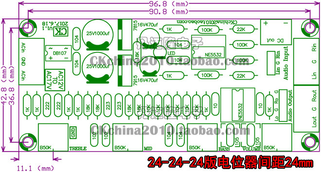 - 24-24-24 PCB длиной 96,8 мм, шириной 42,8 мм, а расстояние между потенциометром-24-24-24
