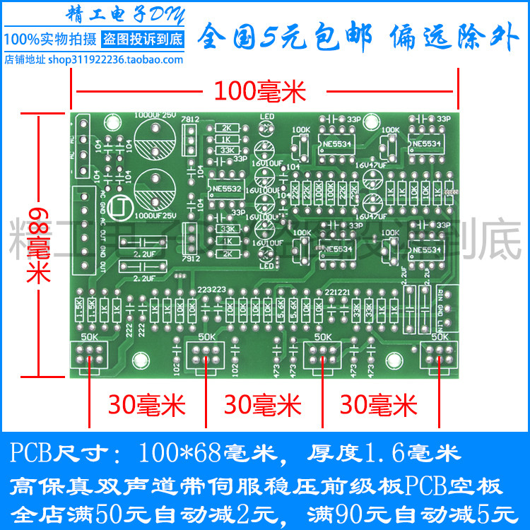 Размер печатной платы: 100*68 мм, толщина 1,6 мм с двойной проводной платой