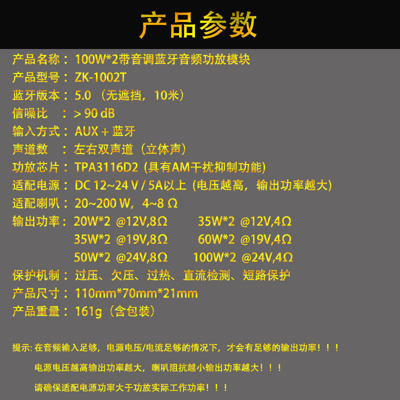 Рекомендуется использовать источник питания 18V19V24V, ток выше 5А.Если у вас есть только источник питания 9V12V или 1A 2A, вы также можете использовать, но мощность невелика. Обратите внимание на максимальную возможность громкости при его использовании и влиять на качество звука.