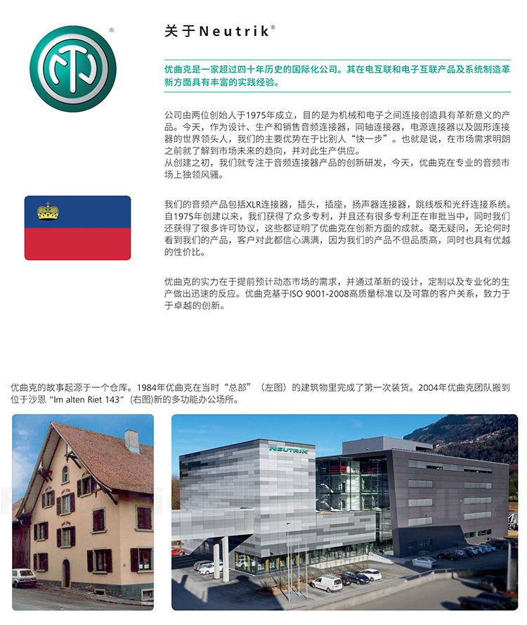 Neutrik был основан в 1975 году. У него более 30 лет технических хитростей и опыта в области электронных межсоединений и производства системы.Сегодня Neutrik находится в мировой позиции в области проектирования, производства и продаж продукции в области аудио, коаксиальной оси, источника питания и круговых разъемов. Секрет успеха компании -“ всего на один шаг впереди противника&Продукты аудио серии, произведенные RDQUO;С 1975 года Neutrik постоянно инновации, с рядом патентных прав и лицензионных соглашений.1 цена