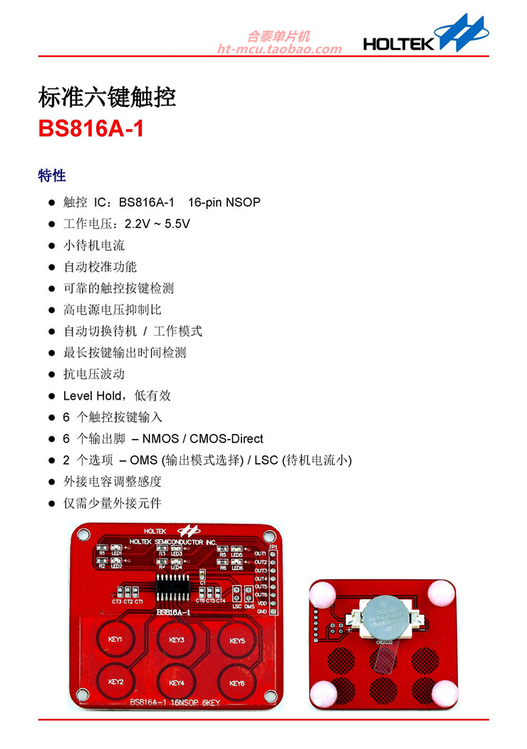 | BS816A-1 Нажмите, чтобы купить | 6-Key | 2.2V~5.5V | 12.0μA/6.0μA* at 3.0V Typ. | Active Low/ Active High* | 16NSOP | -- | v |