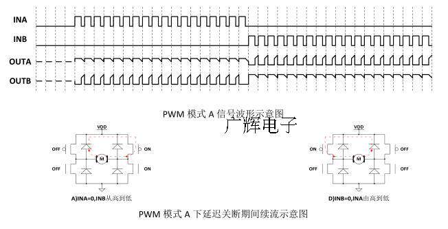 ПРИМЕЧАНИЕ. В режиме PWM A, когда входной сигнал изменяется с высокого уровня на низкую электричество, 4 силовая трубка моста H в соответствии с требованиями логики должна быть