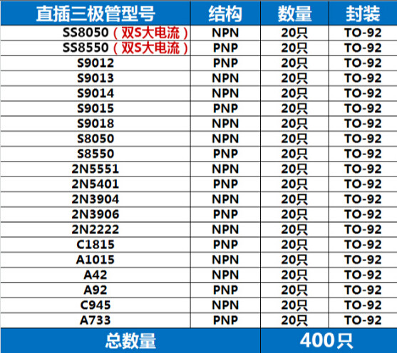 Пакет Triode Little Power 2N5401 2N3904 S8550 S8050 Прямая вставка обычно используется 20 видов в общей сложности 400
