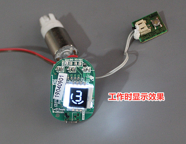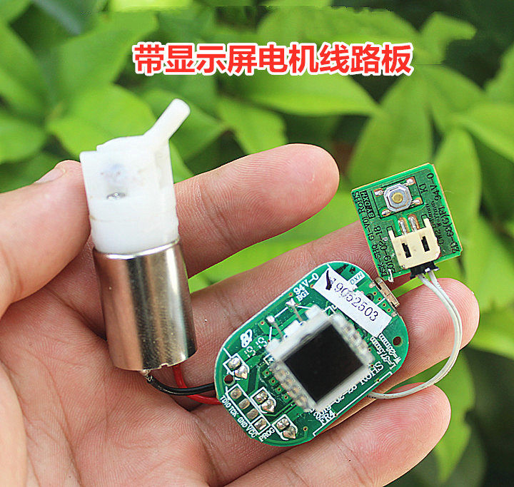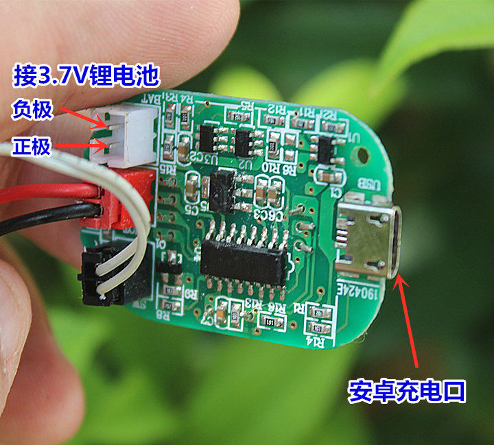 Переплата подключена к литиевой батареи 3,7 В выключатель.Когда мотор работает, удерживание пластикового стержня на руке будет производить вибрацию.На плате есть порт Android, который может зарядить батарею на плате.