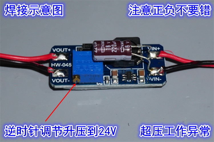 На что следует обратить внимание при самостоятельной сварке модуля наддува. Vin — это входная мощность, а Vout подключен к двигателю. Будьте осторожны, не перепутайте положительный и отрицательный полюса. После подачи напряжения отрегулируйте потенциометр против часовой стрелки примерно на 10 оборотов. С помощью мультиметра проверьте выходное напряжение и отрегулируйте его до 24 В. Из примерно 10 оборотов потенциометра можно эффективно регулировать только около 2 оборотов. Двигатель запустится только после регулировки напряжения, отключения и перезапуска питания. Рекомендуется, чтобы модуль с модулем использовал источник питания 5 В или литиевую батарею 3,7 В. Если источник питания 12 В слишком велик, модуль легко сгорит.